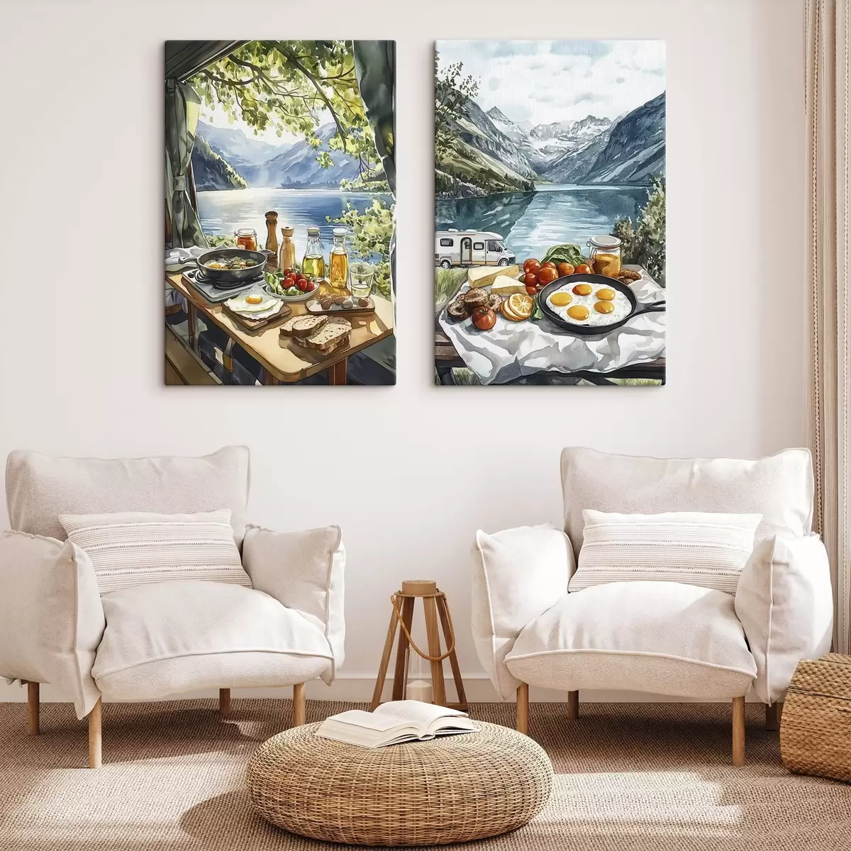 Картина Кемпінг, естетичний сніданок біля озера, акварельний стиль Арт. m00405