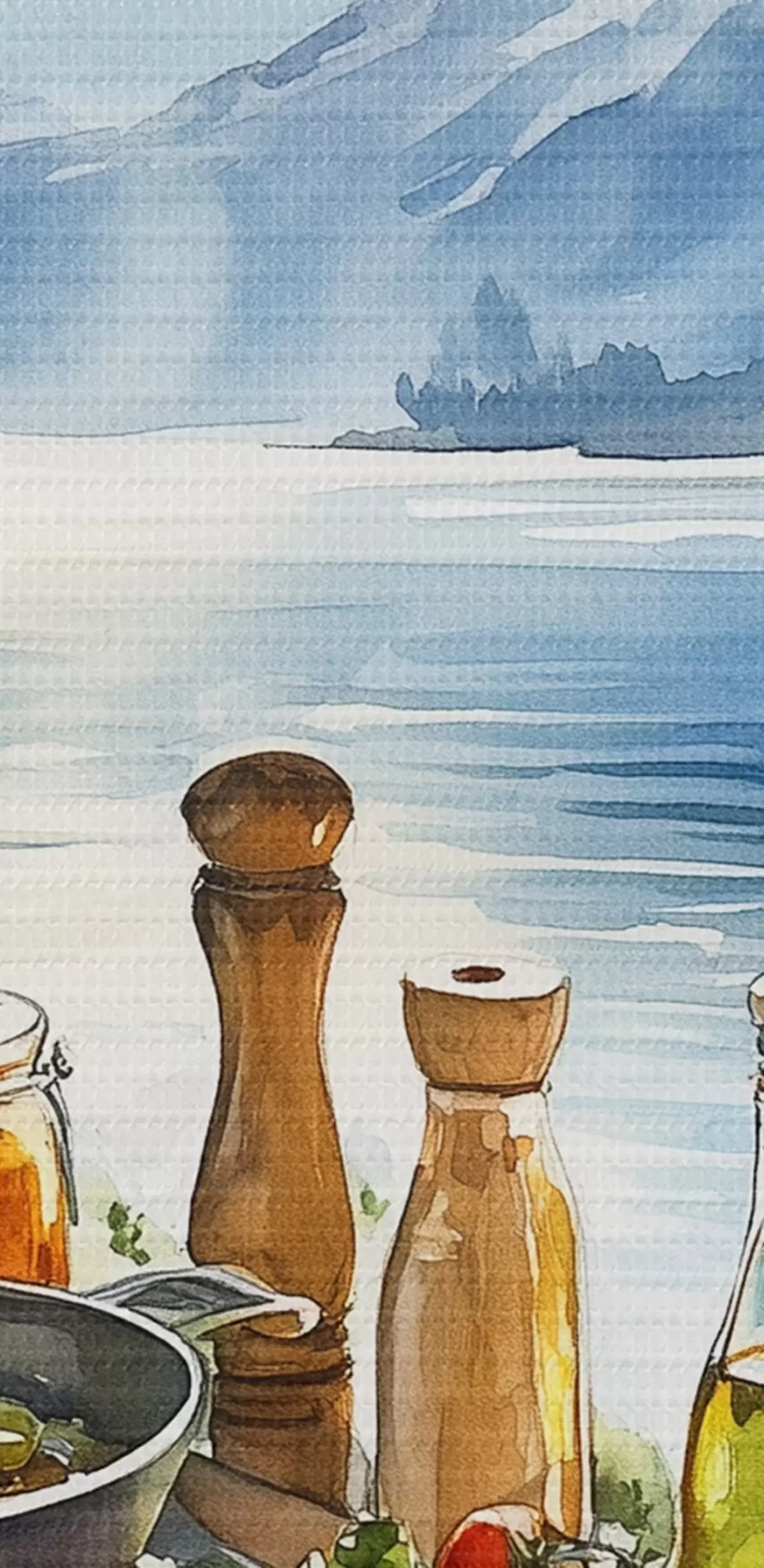 Картина Кемпінг, естетичний сніданок біля озера, акварельний стиль m00405