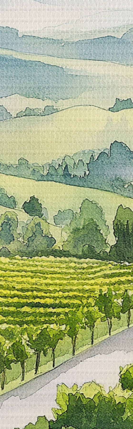 Картина Красиві тосканські пейзажі, виноградники, келихи для вина, акварельний стиль, Італія Арт. m00408