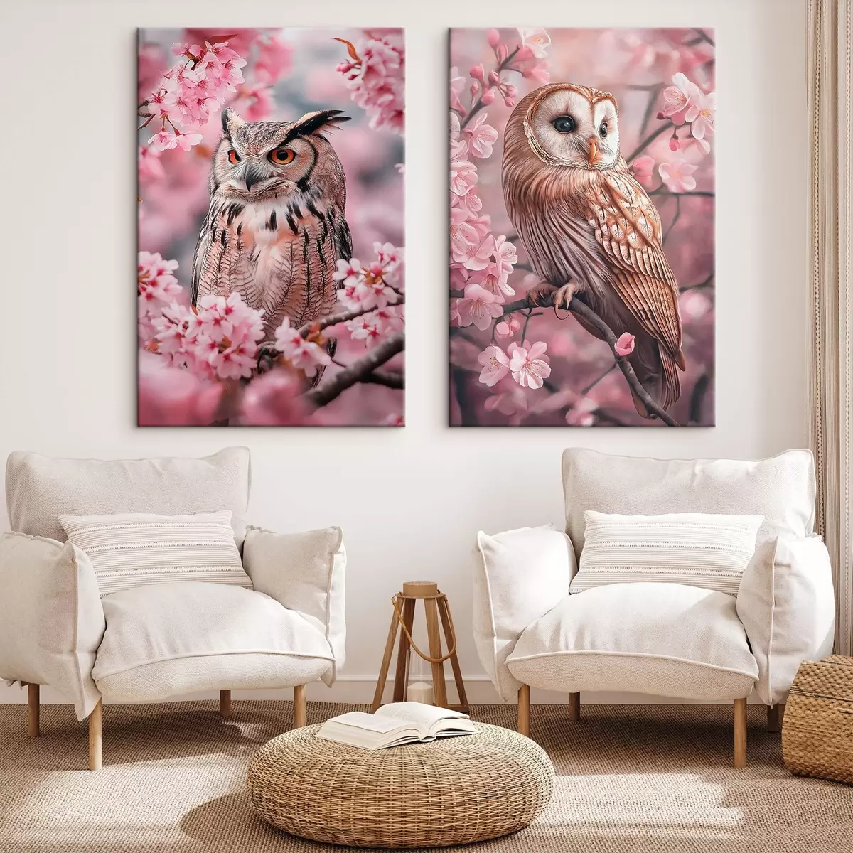 Картина Сови на вишні, рожеві квіти, реалізм, природа m00411