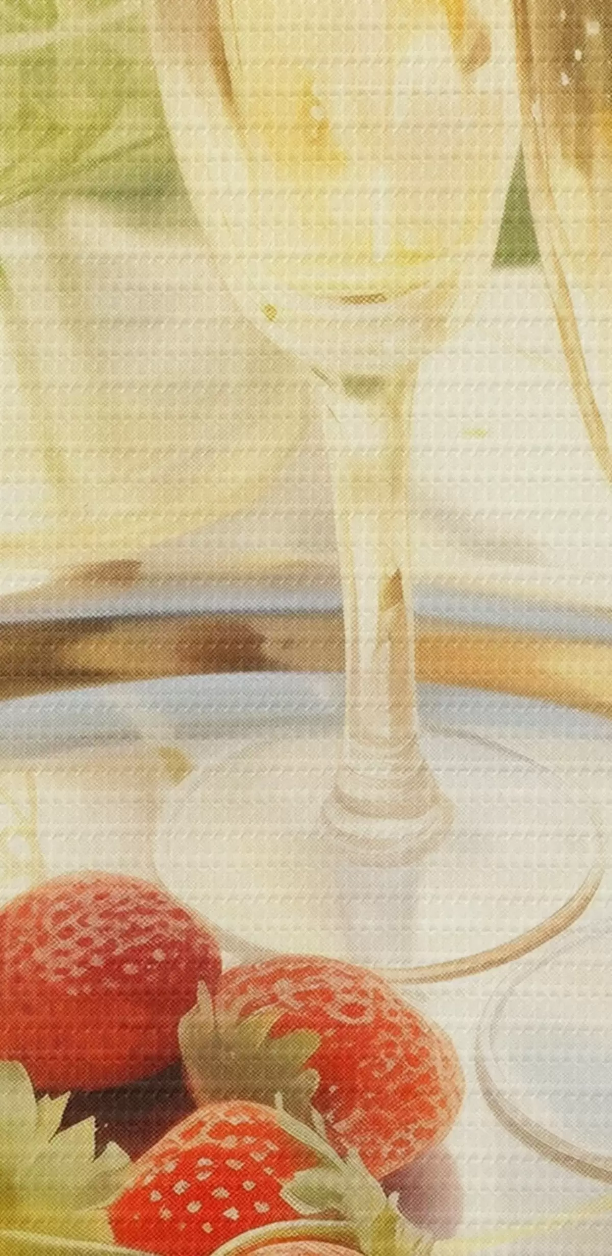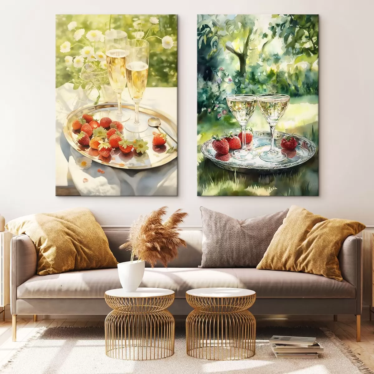 Картина Літній пікнік, келихи для шампанського з полуницею на підносі, квіти ромашки Арт. m00414
