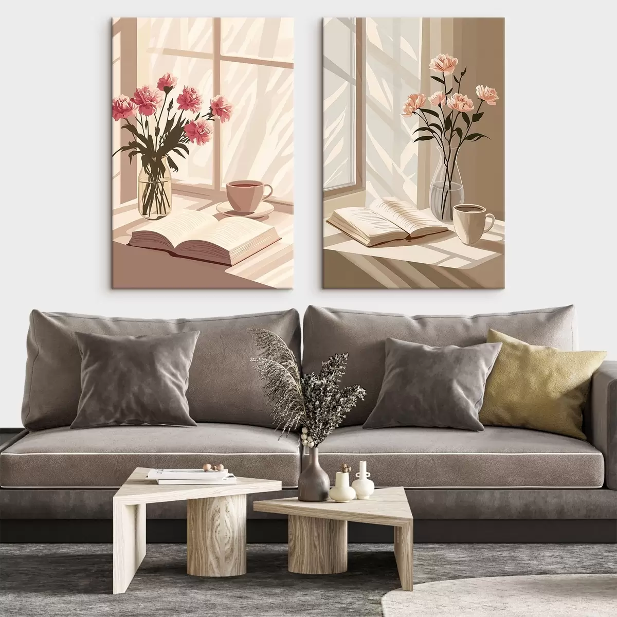 Картина Абстракція, ранкова естетика, філіжанка кави, книга, квіти Арт. m00448