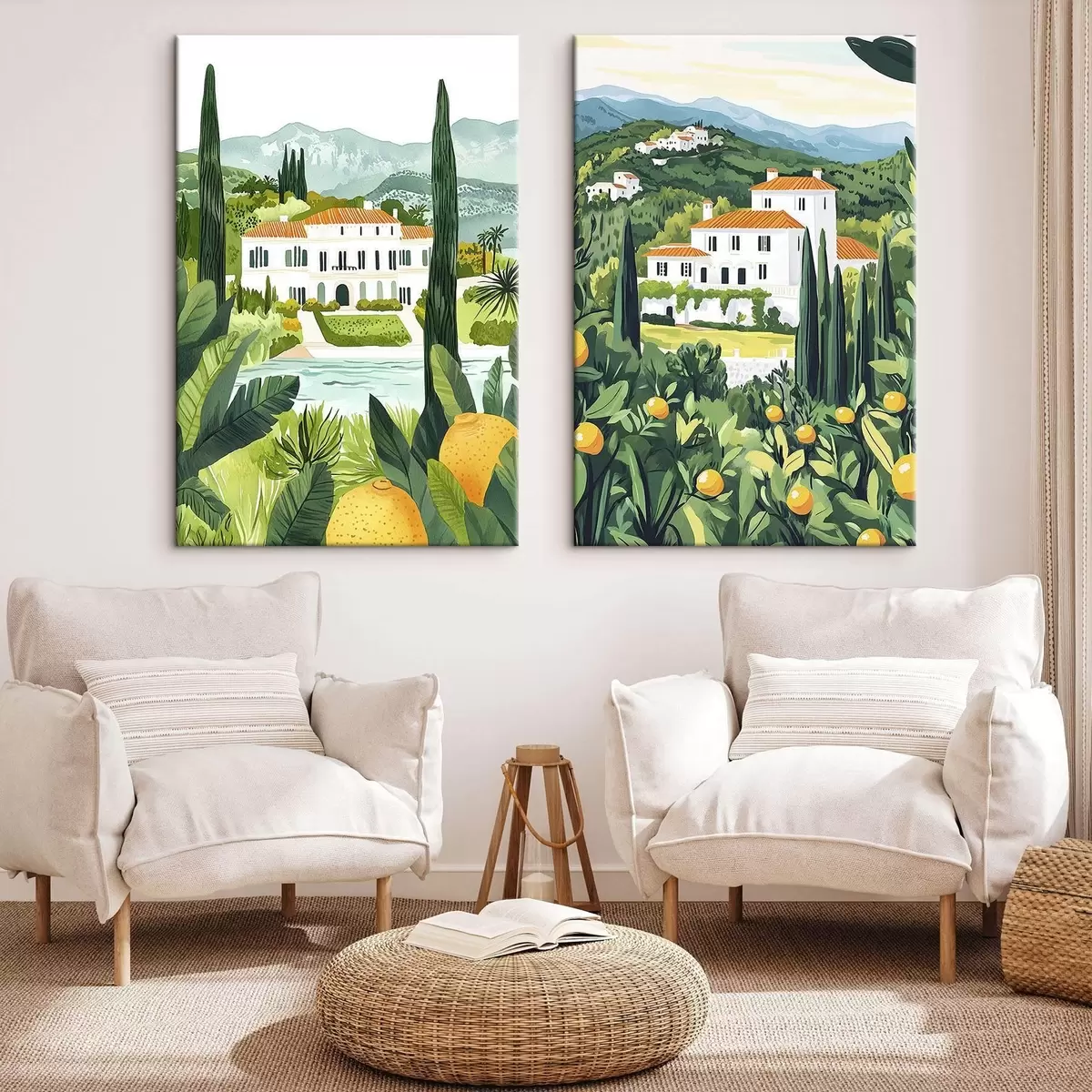 Картина Середземноморські пейзажі з деревами та будинками, морське узбережжя, Іспанія Арт. m00450