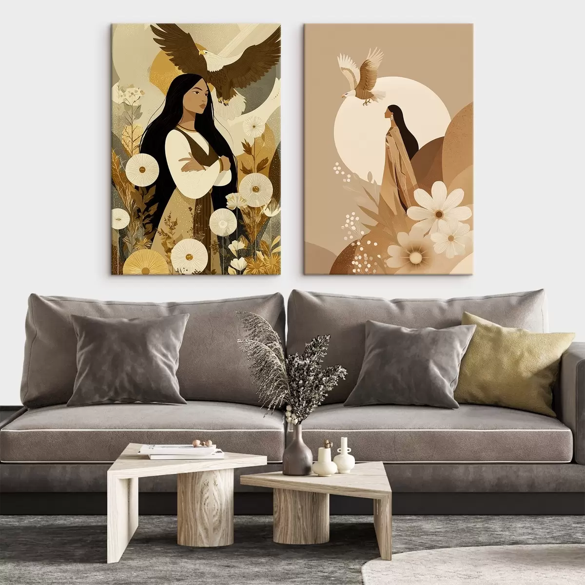 Картина Жінки з орлами, племінний стиль, бежеві кольори m00477