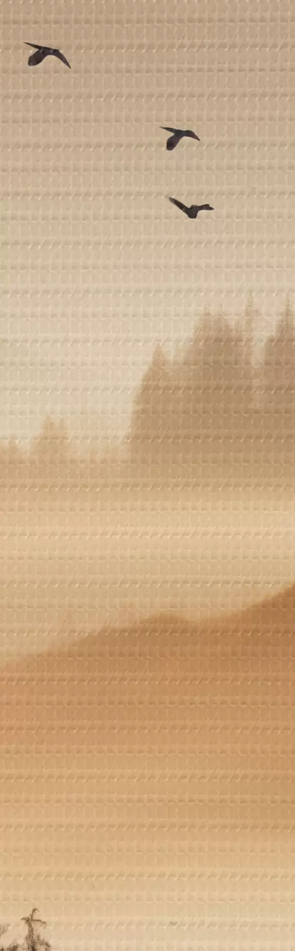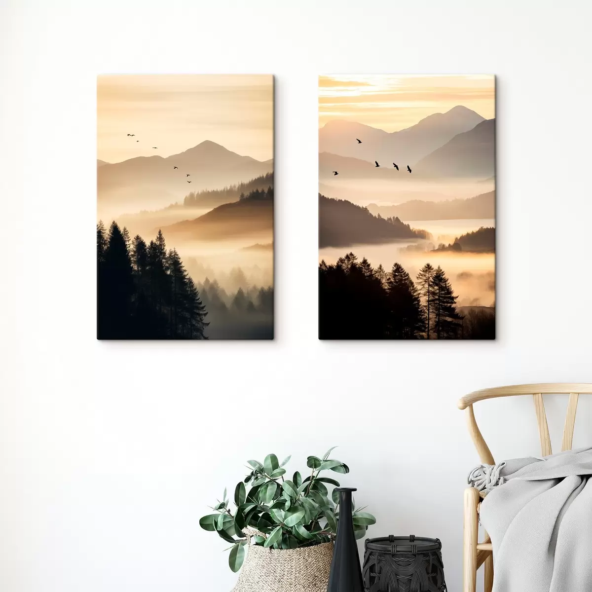 Картина Гірський пейзаж з лісом і птахами, що літають у небі, вкритий товстим шаром туману під час сходу сонця Арт. m00651