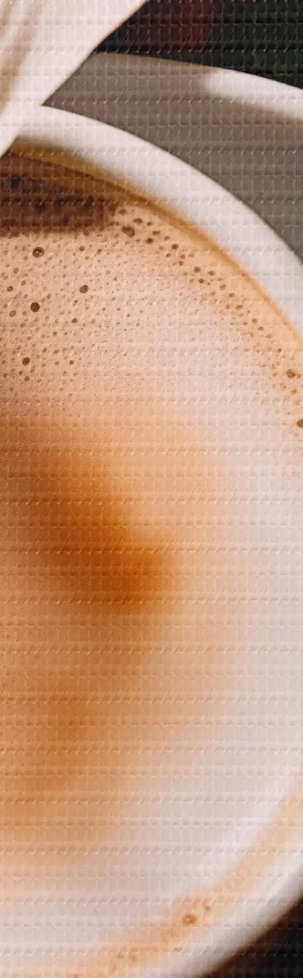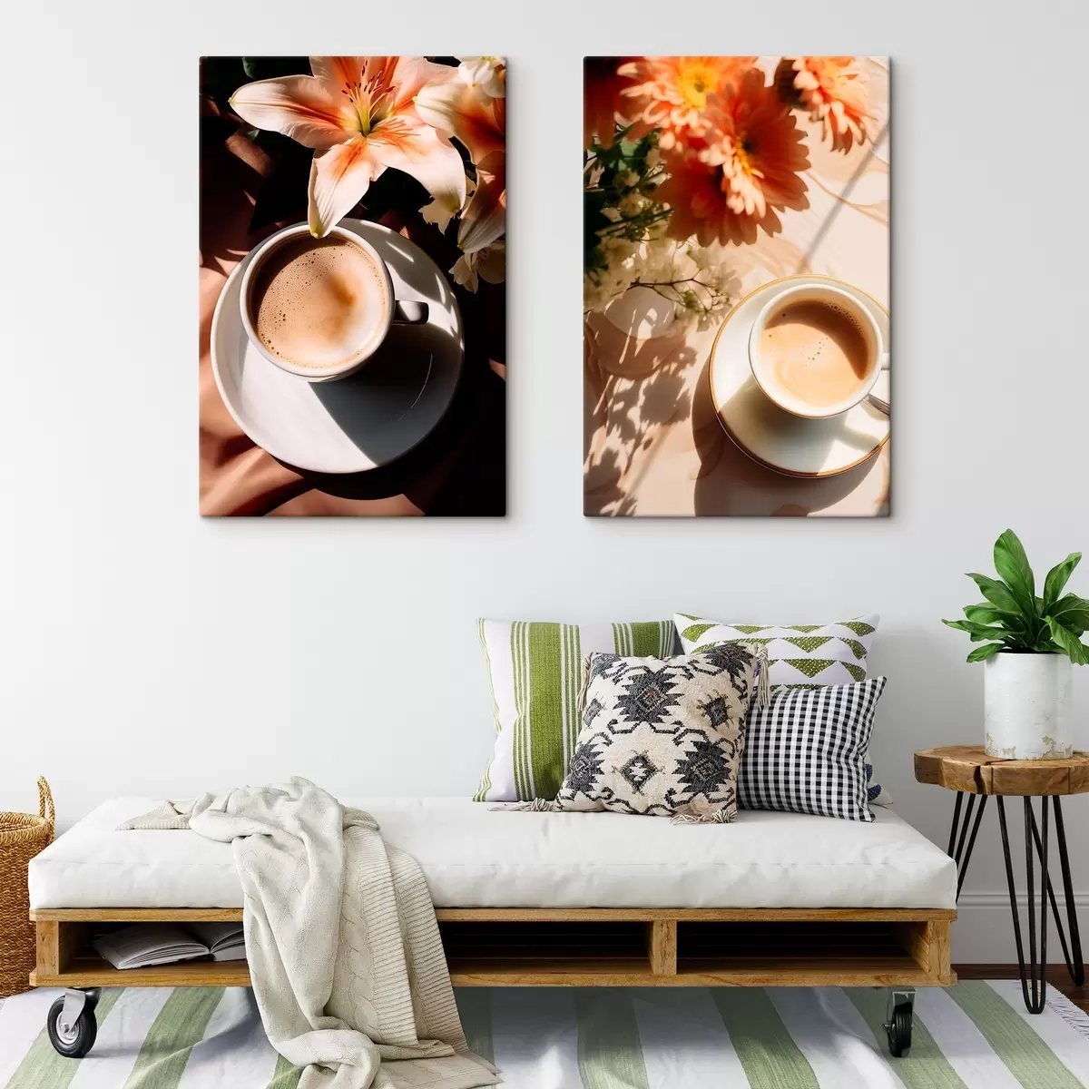 Картина Чашка кави з пінкою на білій тарілці, квіти на задньому плані, сонячне світло Арт. m00654