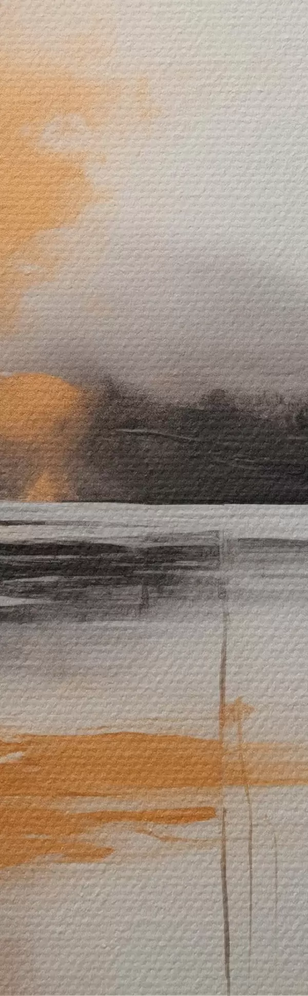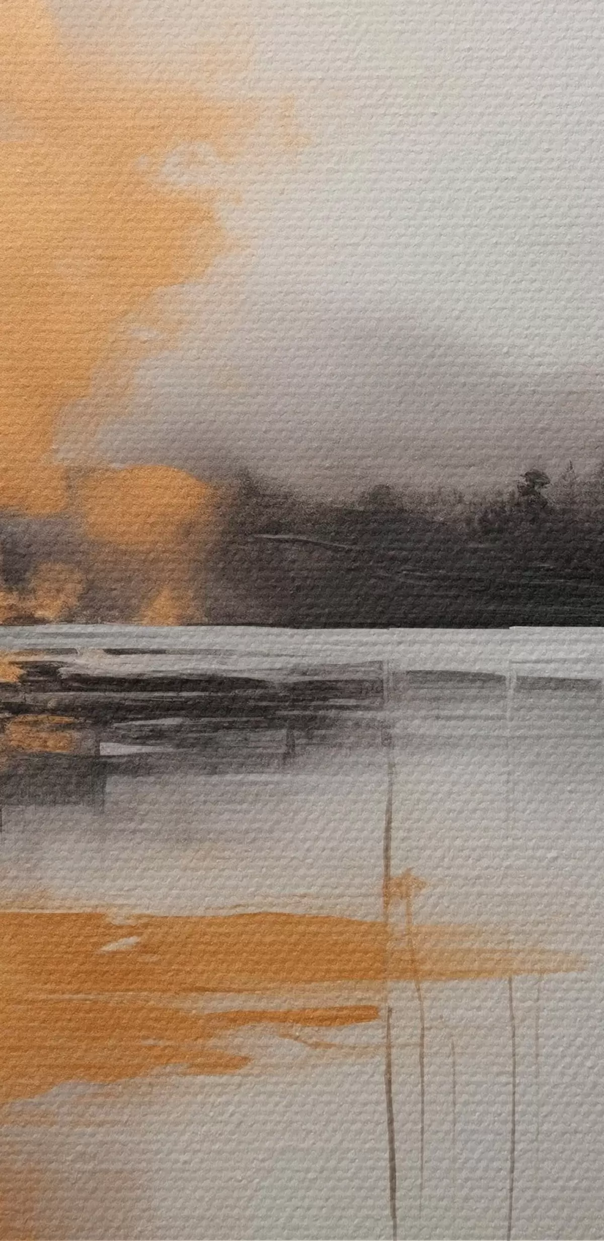 Картина Абстрактний пейзаж з озером, деревами та жовтим туманом, у якому відбивається вода та хмарне небо Арт. m00657