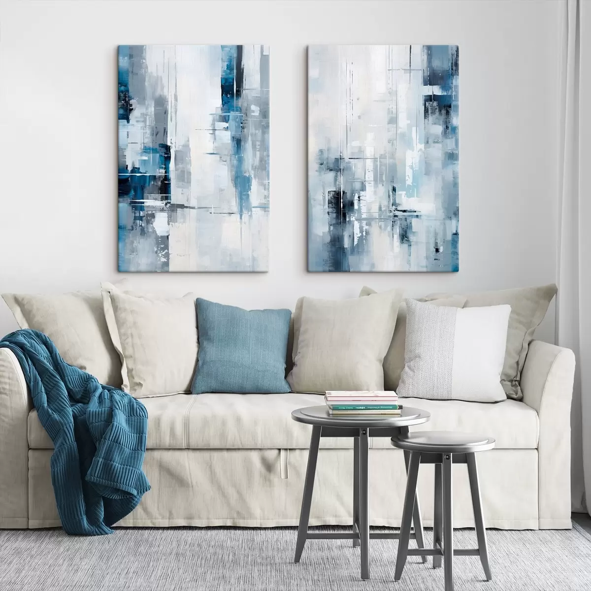 Картина Абстрактна імітація живопису з використанням синього, сірого та білого кольорів, вертикальних ліній та геометричних фігур Арт. m00819