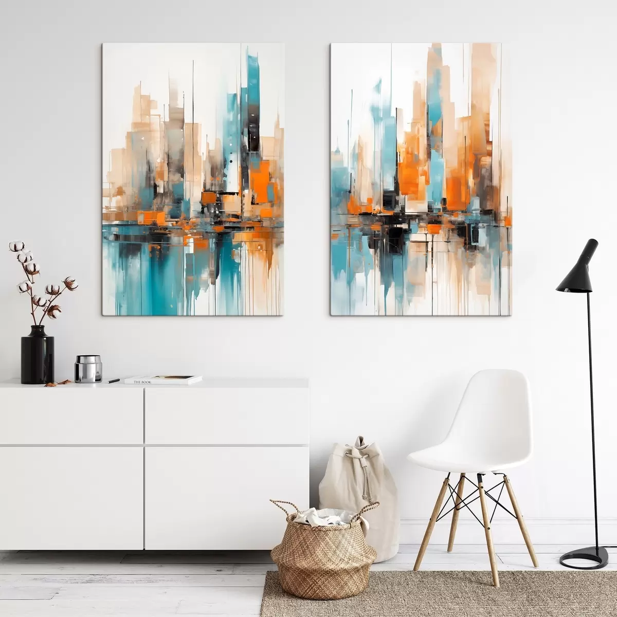 Картина Абстрактний міський пейзаж з вертикальними мазками в відтінках оранжевого, синього та білого, стиль живопису Арт. m00876