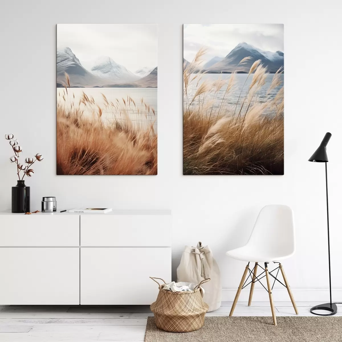 Картина Трава пампас на тлі озера і гір, м'яке освітлення, приглушені кольори, натуралістичний стиль Арт. m00884