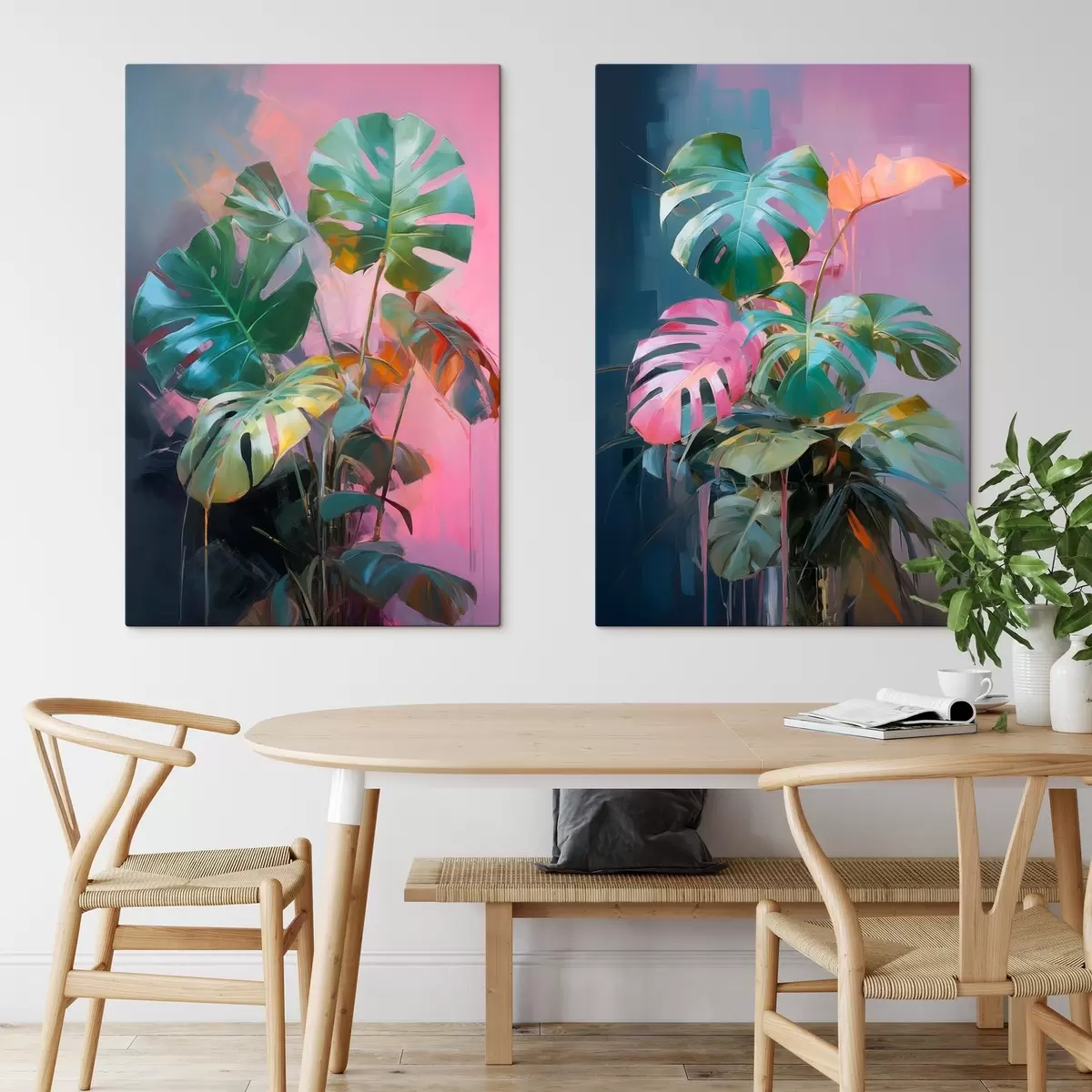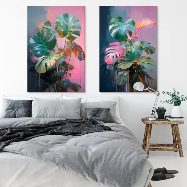 Картина Абстрактна рослина монстера з яскраво-зеленим листям на тлі ніжних рожевих і фіолетових відтінків Арт. m00886