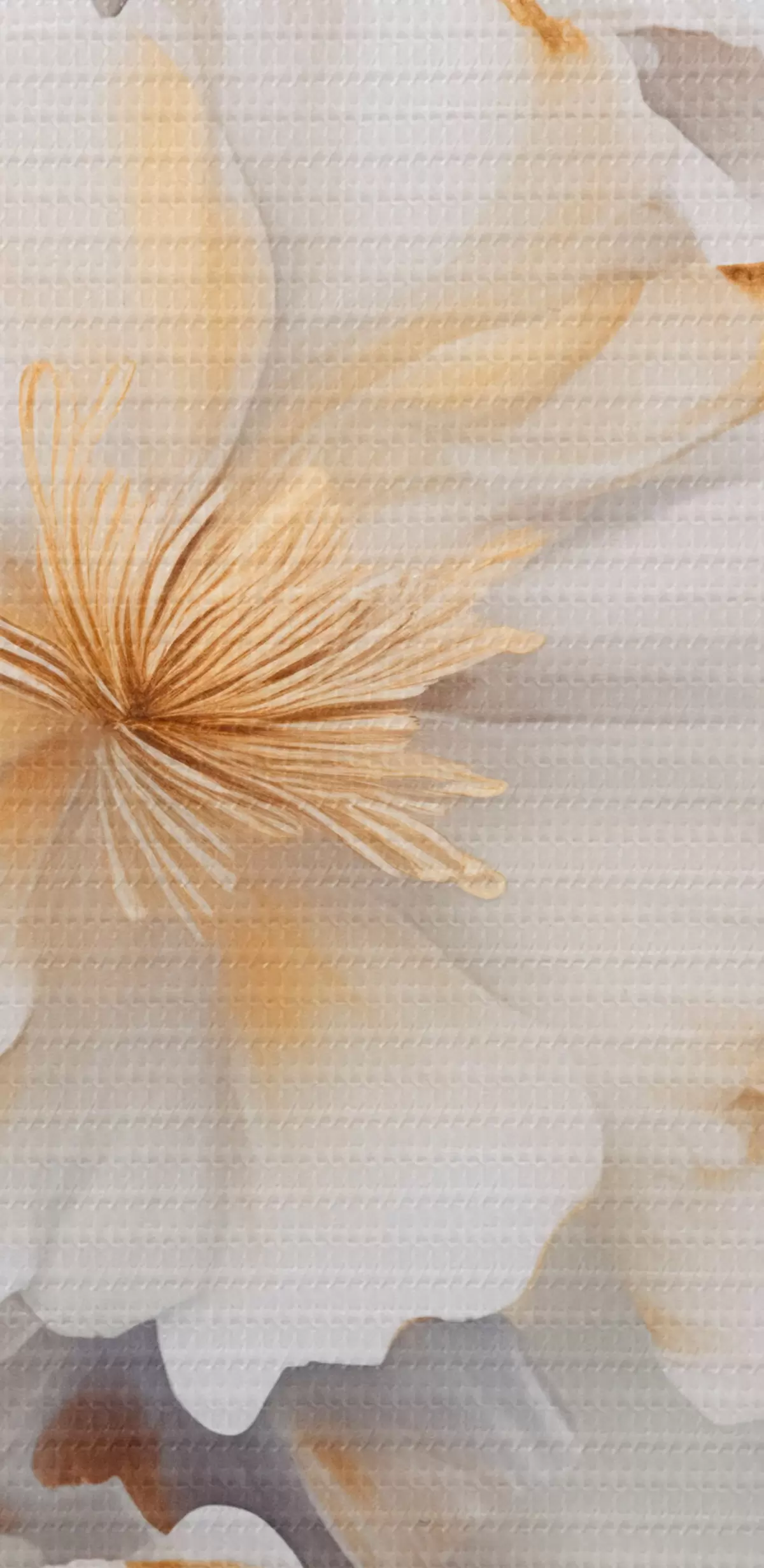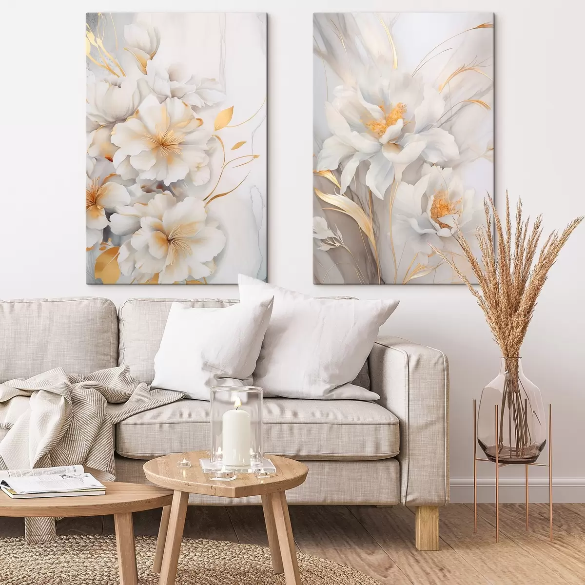 Картина Білі квіти з жовтими деталями, пелюстки з легкими тінями, світлий фон з легким мармуровим ефектом Арт. m00889