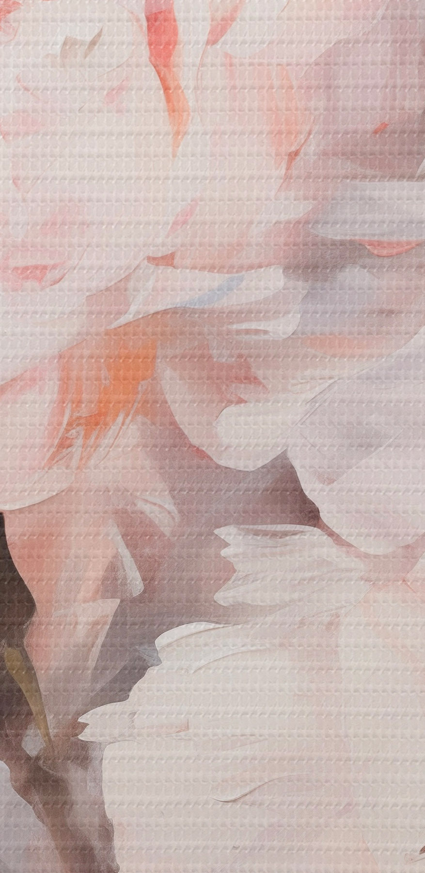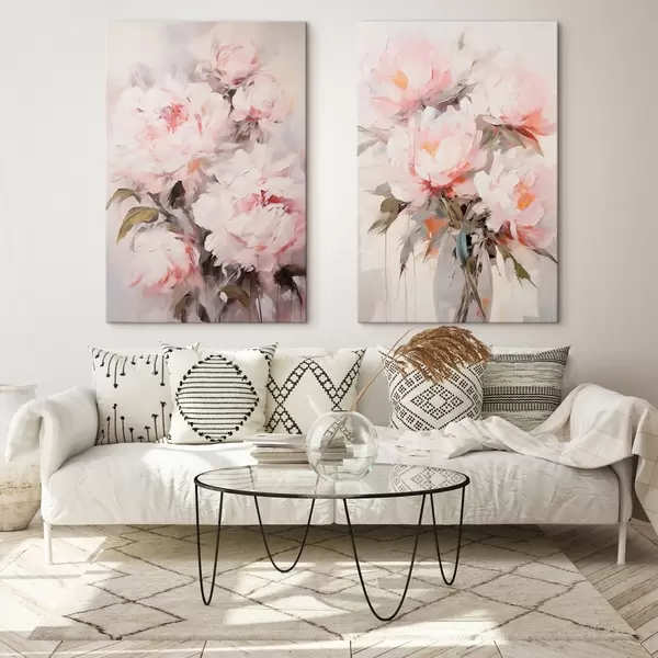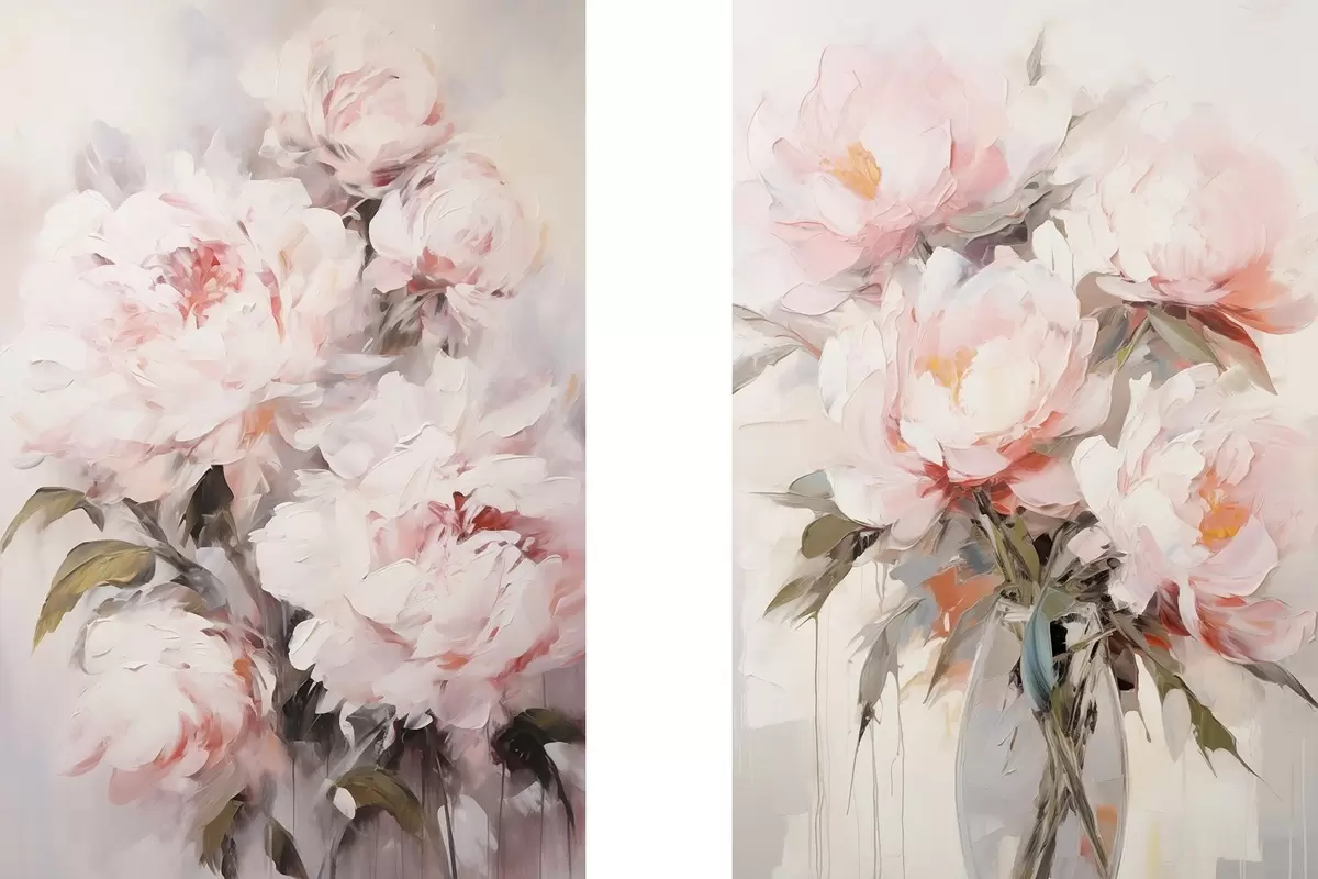 Картина Букет світло-рожевих півоній із зеленим листям, м'які мазки, пастельні кольори, на світлому тлі Арт. m00890