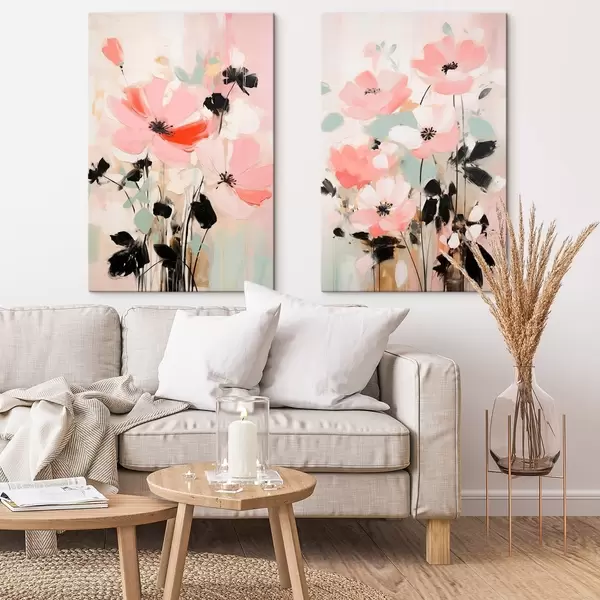 Картина Рожеві та чорні квіти з листям, м'які пастельні кольори, абстрактна квіткова композиція, мінімалістичне мистецтво Арт. m01004