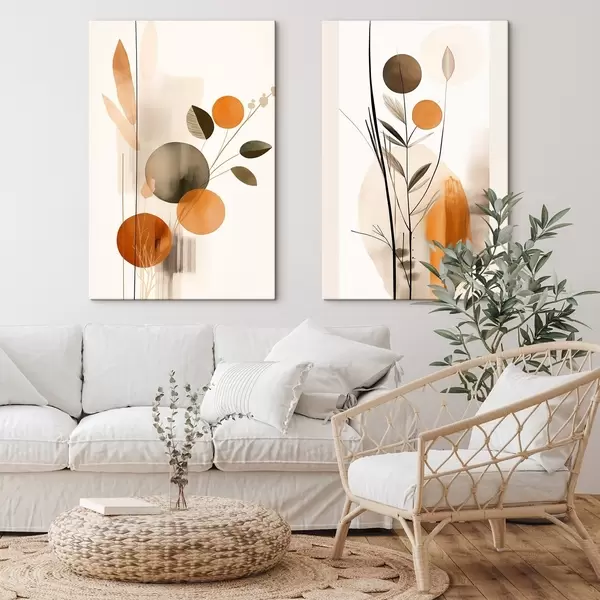 Картина Абстрактна імітація живопису з помаранчевими та сірими колами, листям і гілками, сучасний стиль, ефект акварелі Арт. m01009