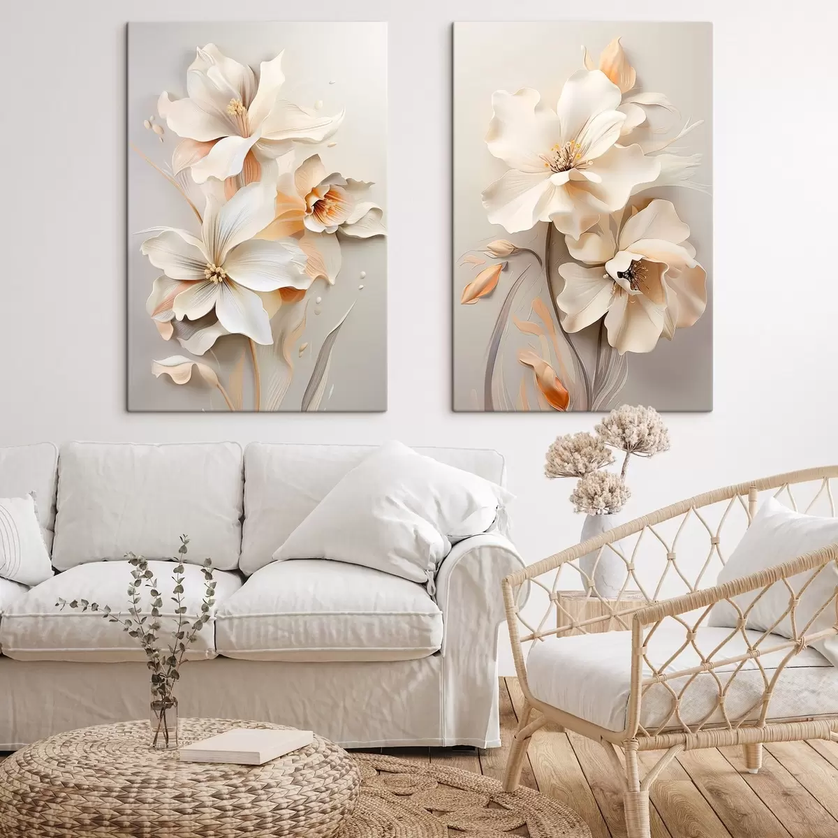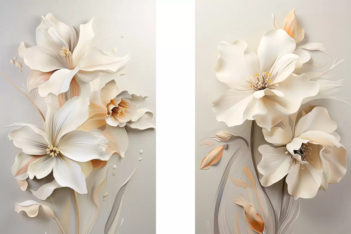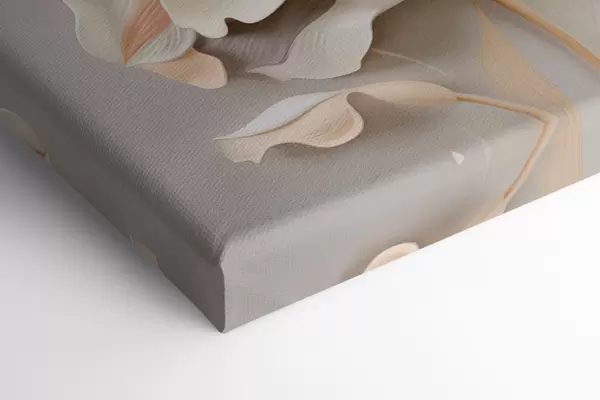 Картина Білі квіти, пелюстки з м'якими тінями, світло-бежевий фон, елегантна композиція, мінімалістичний стиль m01010