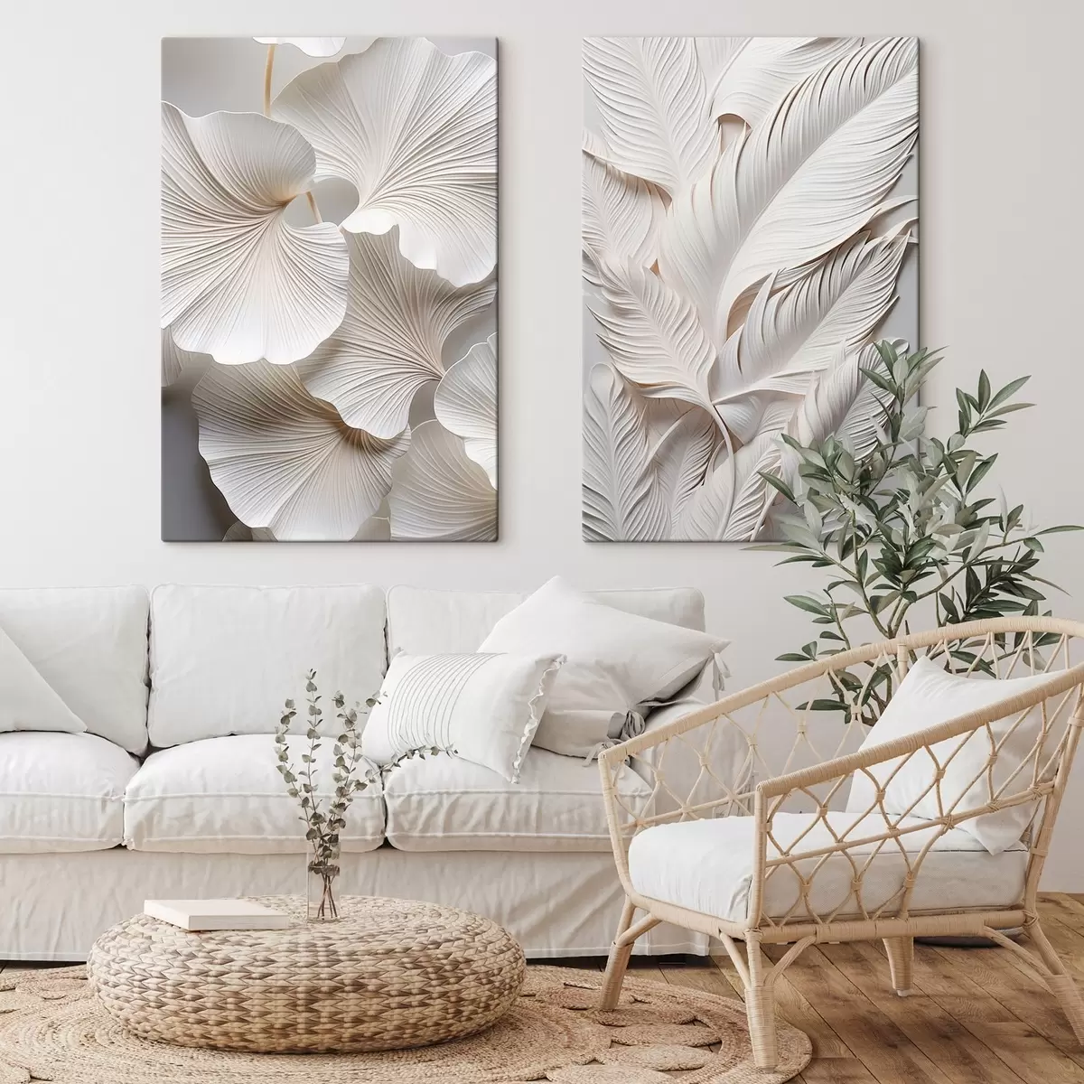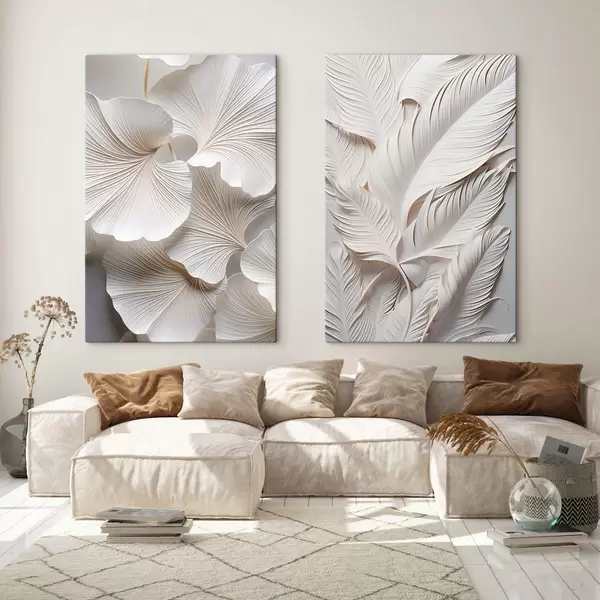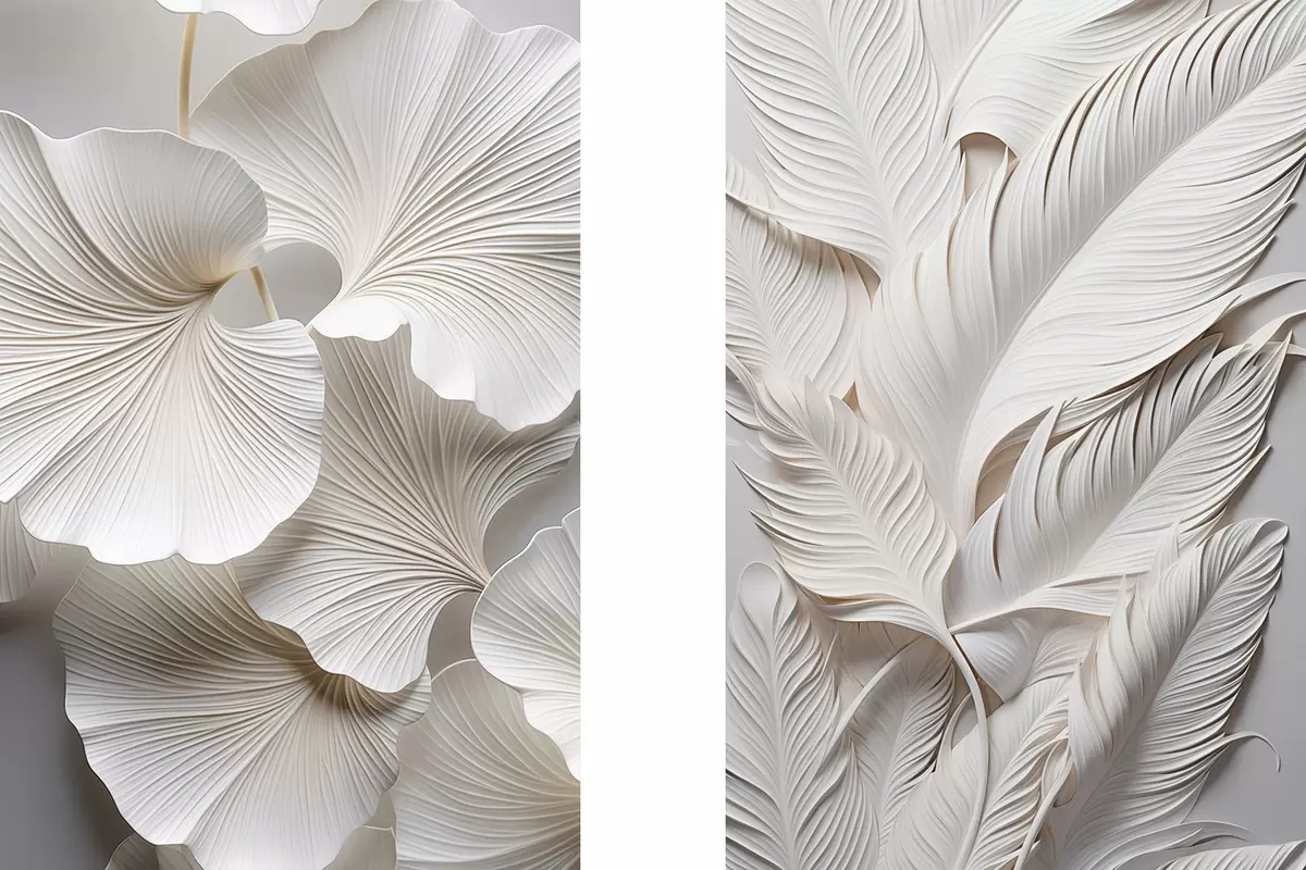 Картина Білі листя гінкго і довгі листя з витонченими деталями, що створюють ефект текстури і багатошаровості, мінімалістичне мистецтво Арт. m01013