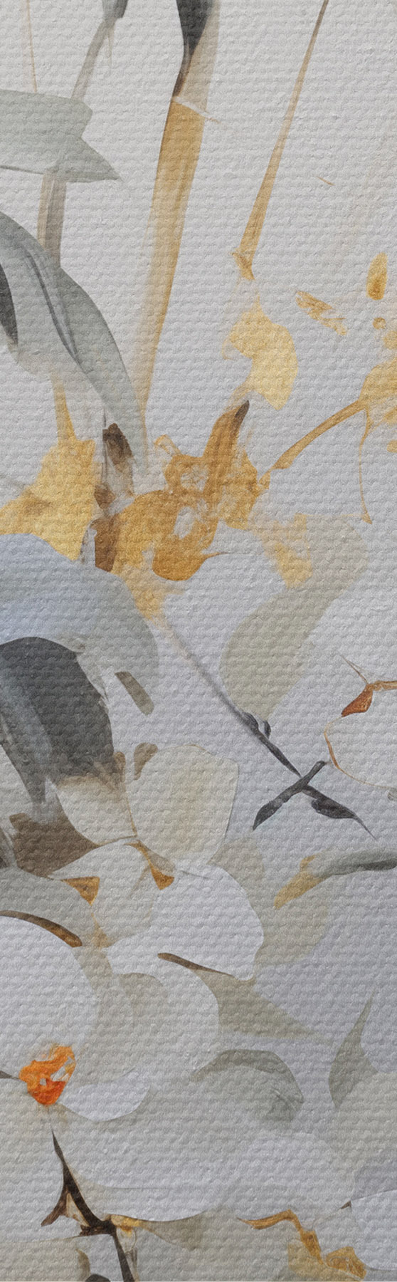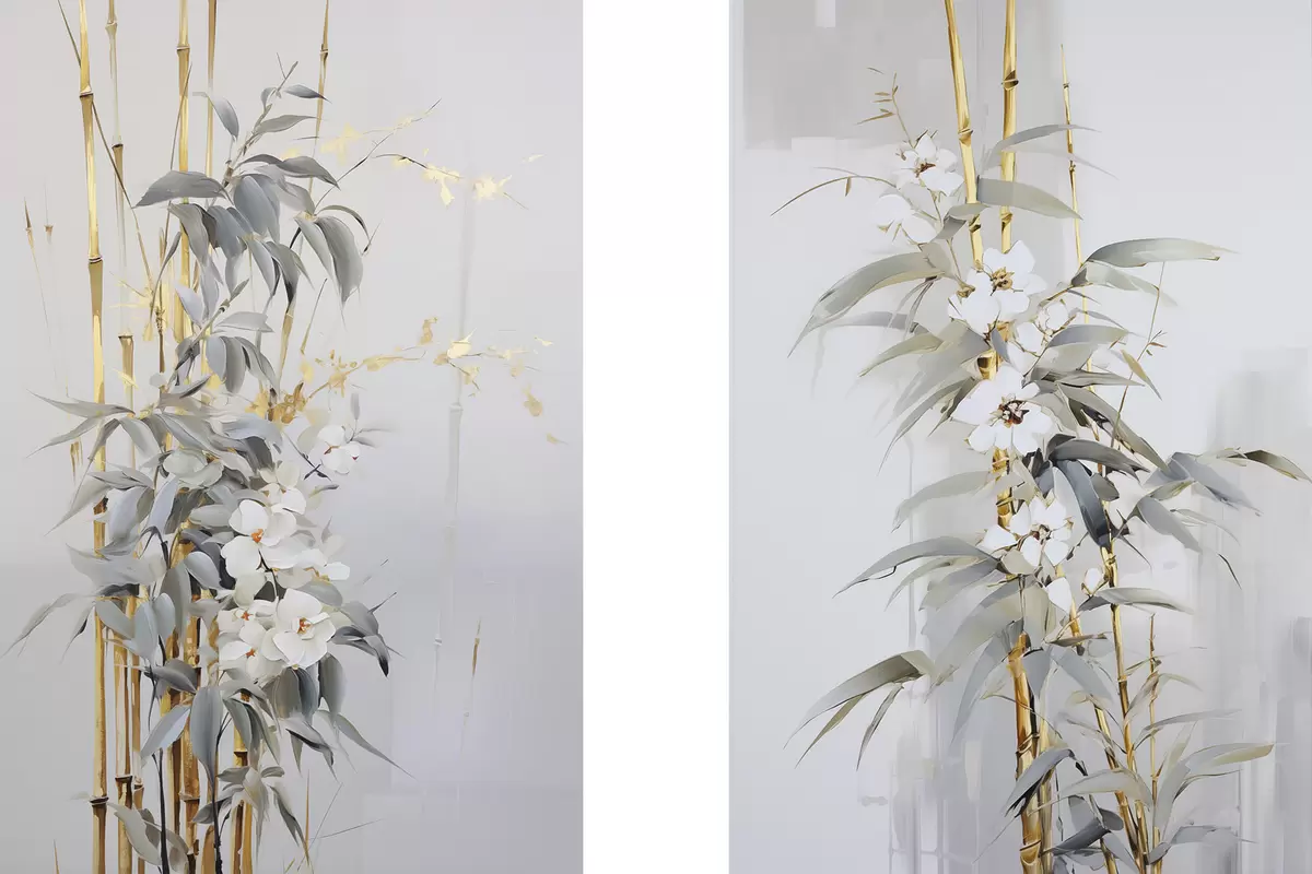 Картина Абстрактні бамбукові стебла з жовтими акцентами, ніжні білі квіти та блідо-зелене листя, сірий фон Арт. m01127