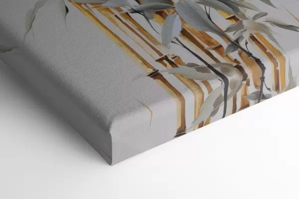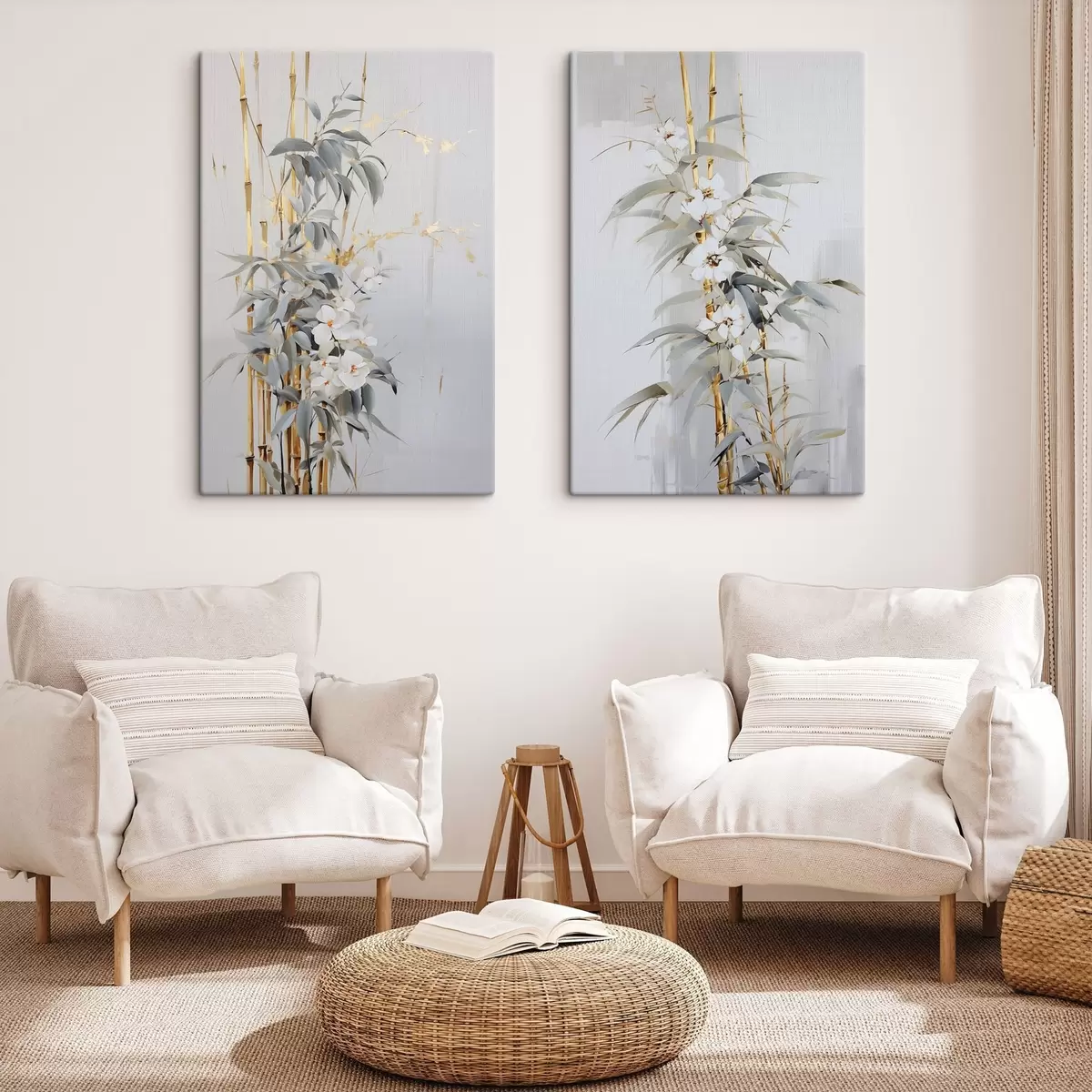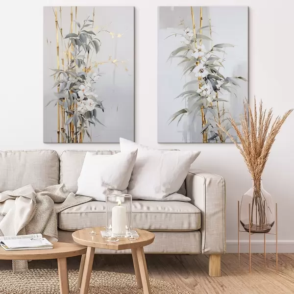 Картина Абстрактні бамбукові стебла з жовтими акцентами, ніжні білі квіти та блідо-зелене листя, сірий фон m01127