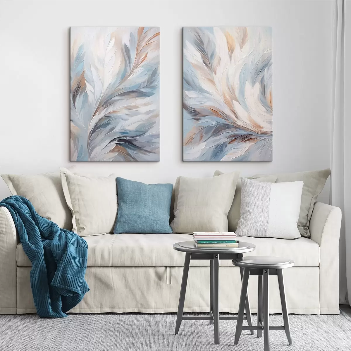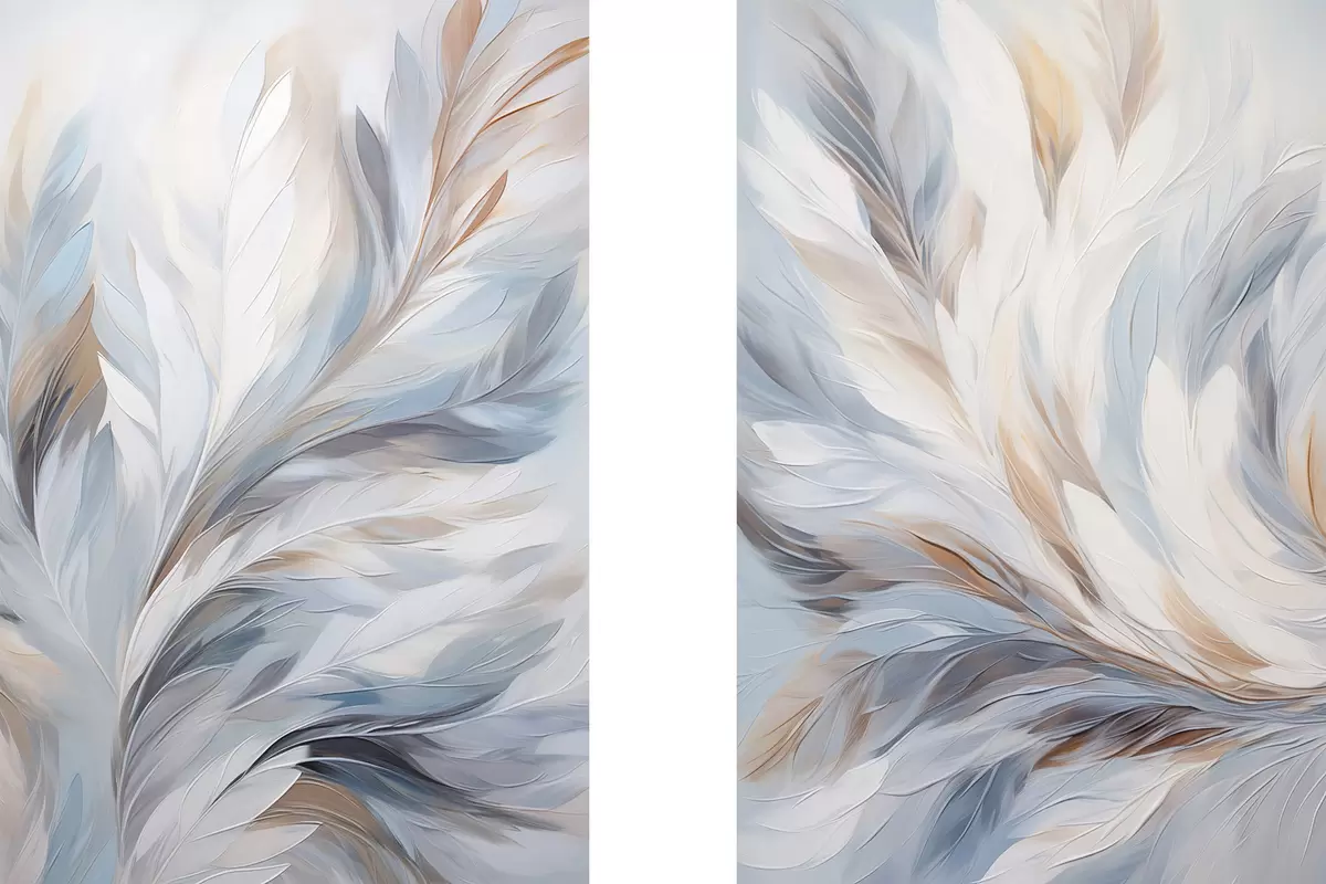 Картина Абстрактне зображення пір'я в відтінках білого, синього та коричневого кольорів, з м'якою, плавною текстурою та світлим фоном. Арт. m01234