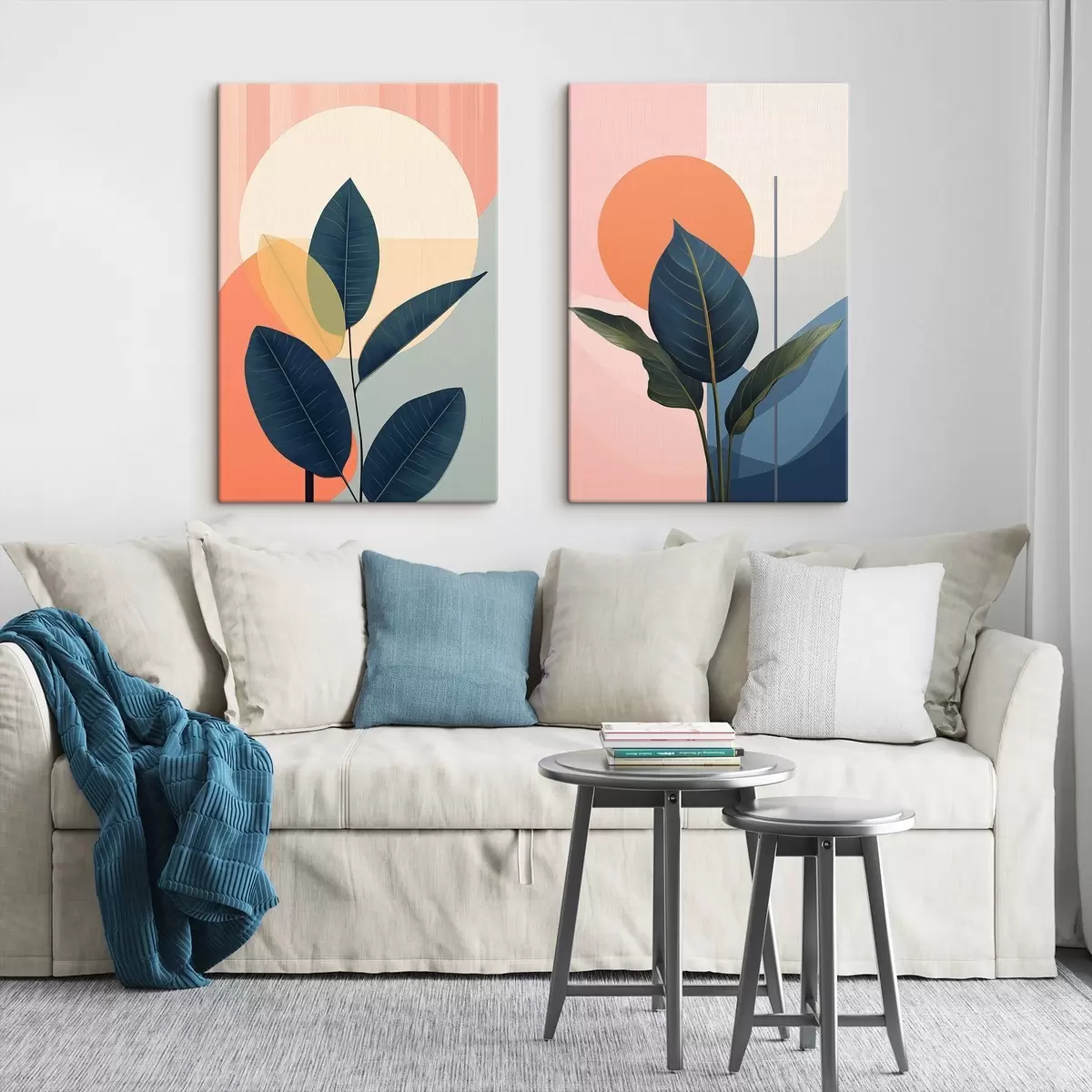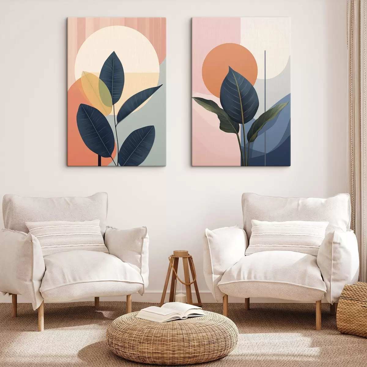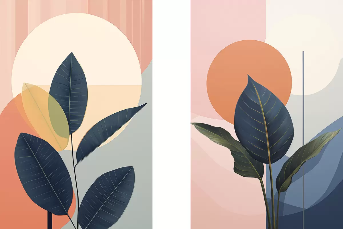Картина Темне листя на тлі абстрактних фігур персикового та сірого кольорів з великим блідо-жовтим колом Арт. m01238