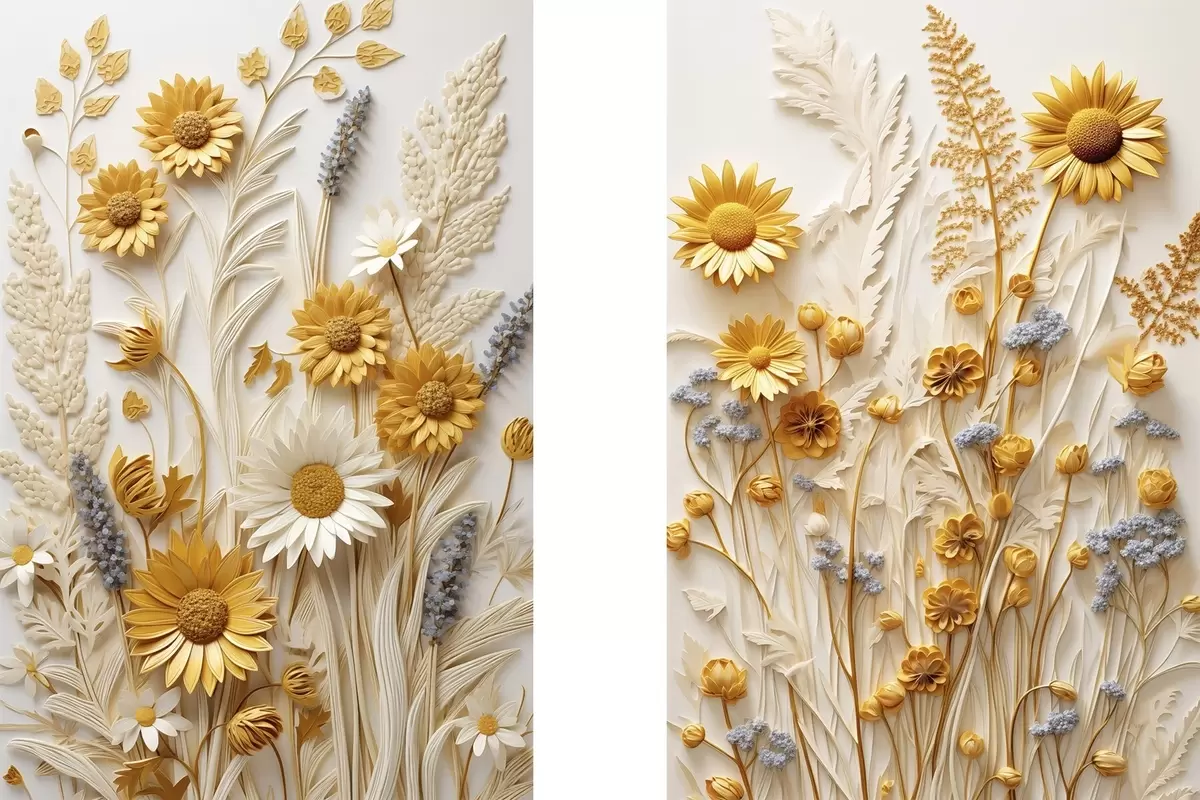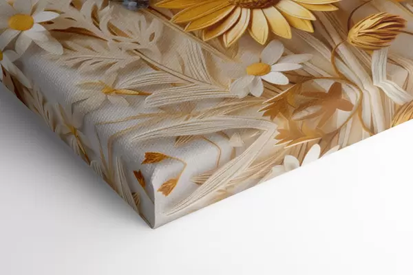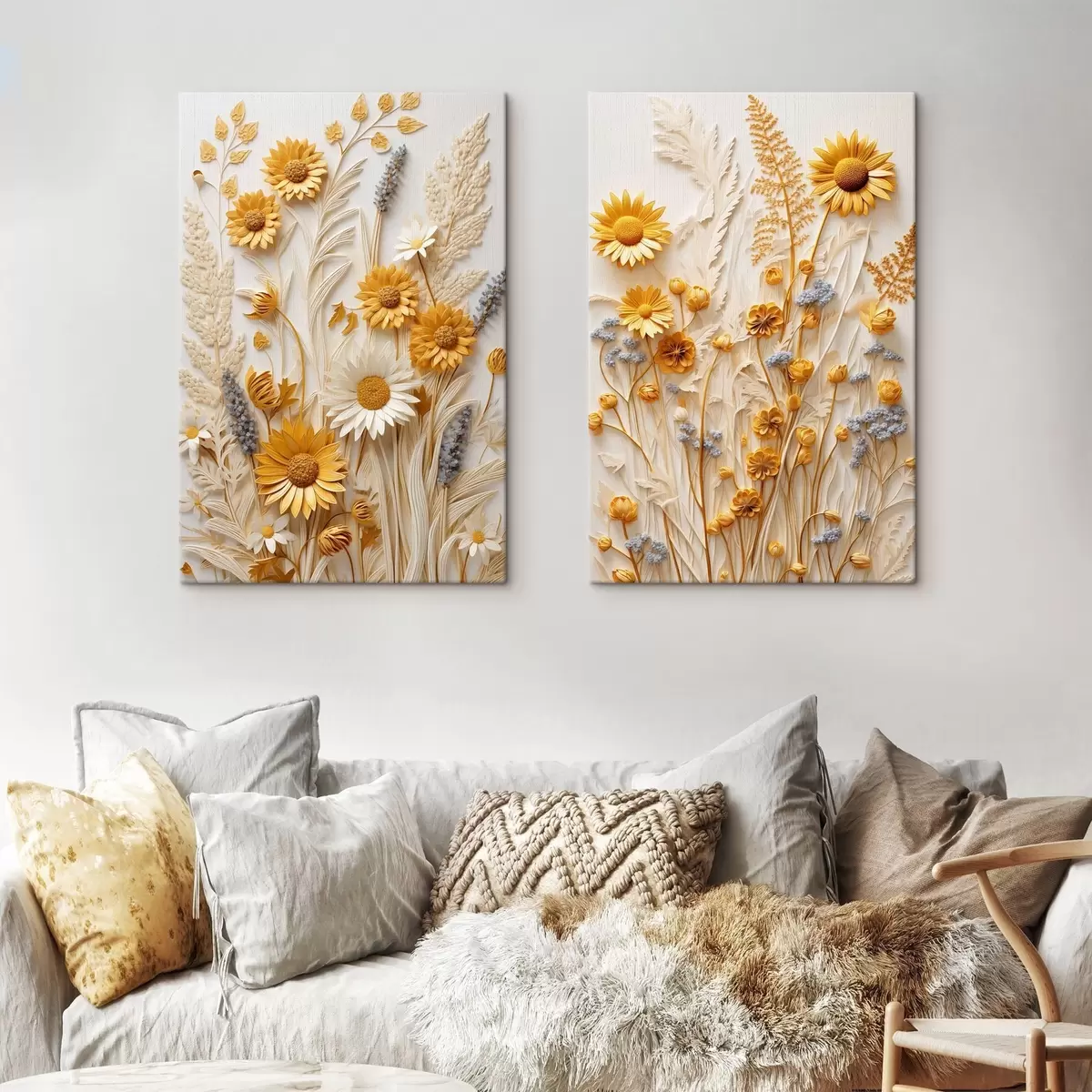 Картина Текстурована колекція жовтих і білих маргариток із сухими травами та гілочками лаванди на білому тлі m01241