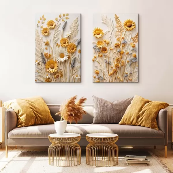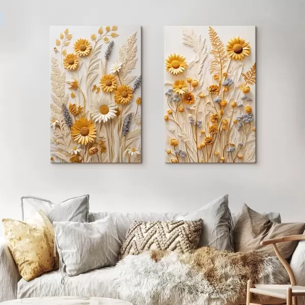 Картина Текстурована колекція жовтих і білих маргариток із сухими травами та гілочками лаванди на білому тлі Арт. m01241