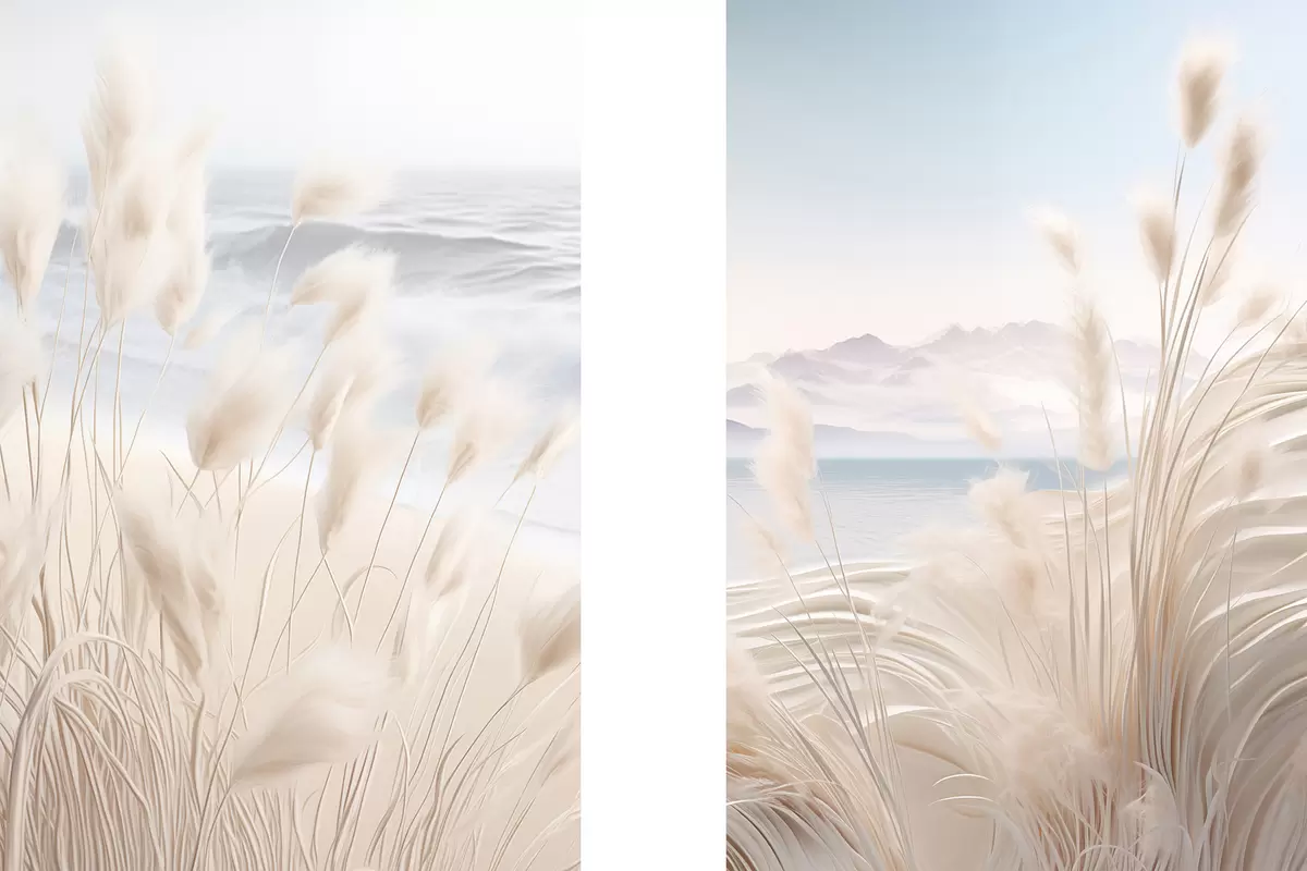 Картина Висока, пухнаста трава пампасу в м'яких бежевих тонах на передньому плані, з піщаним пляжем на задньому плані m01242
