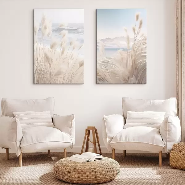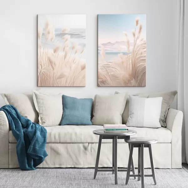 Картина Висока, пухнаста трава пампасу в м'яких бежевих тонах на передньому плані, з піщаним пляжем на задньому плані Арт. m01242