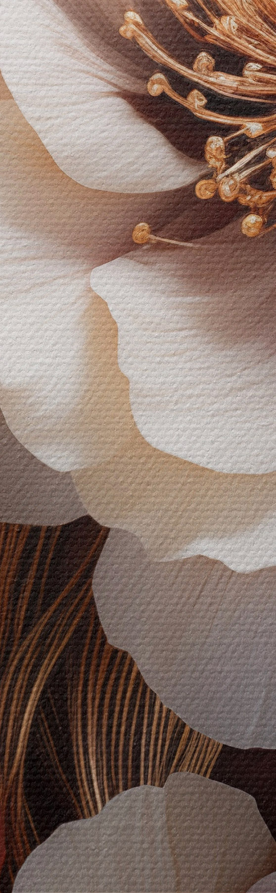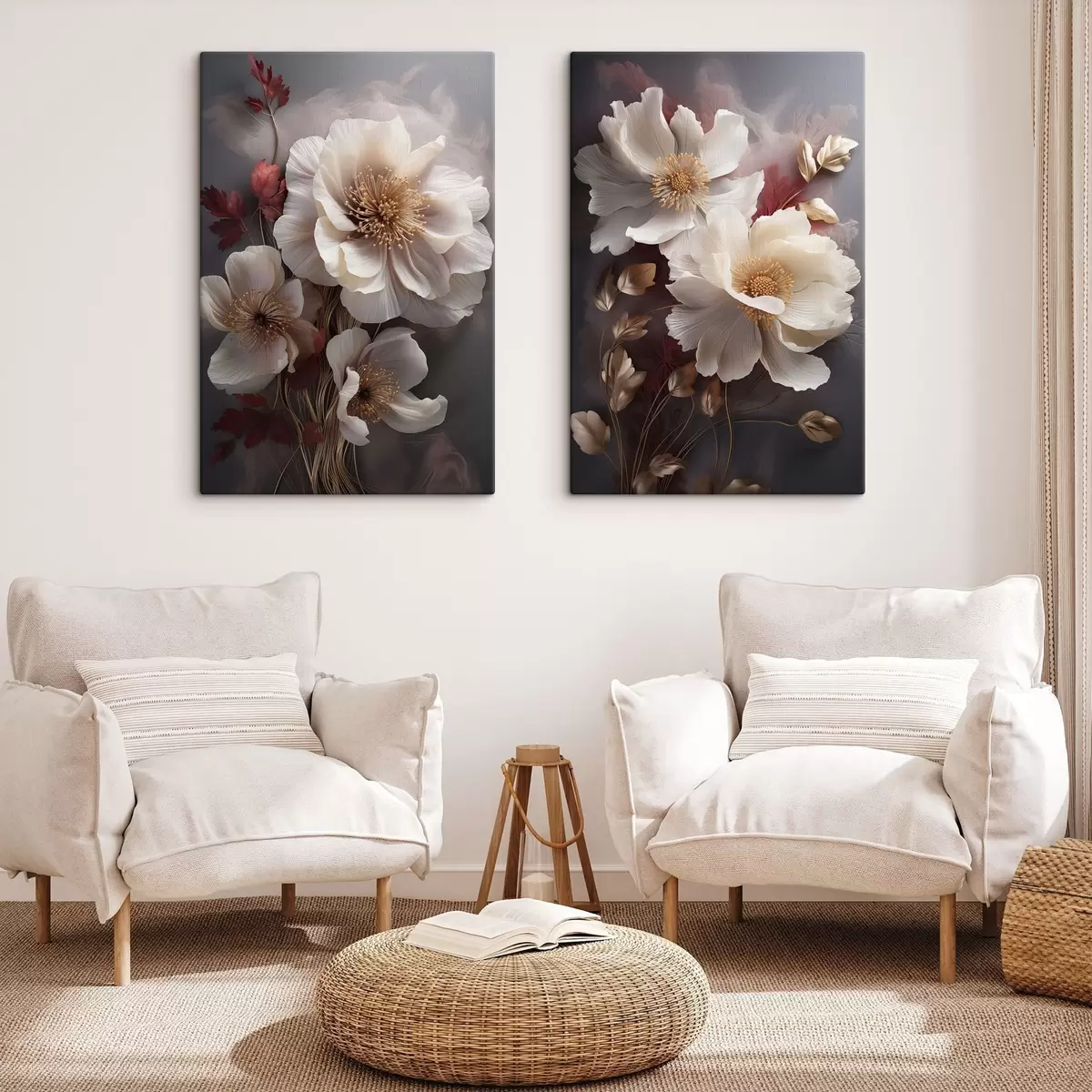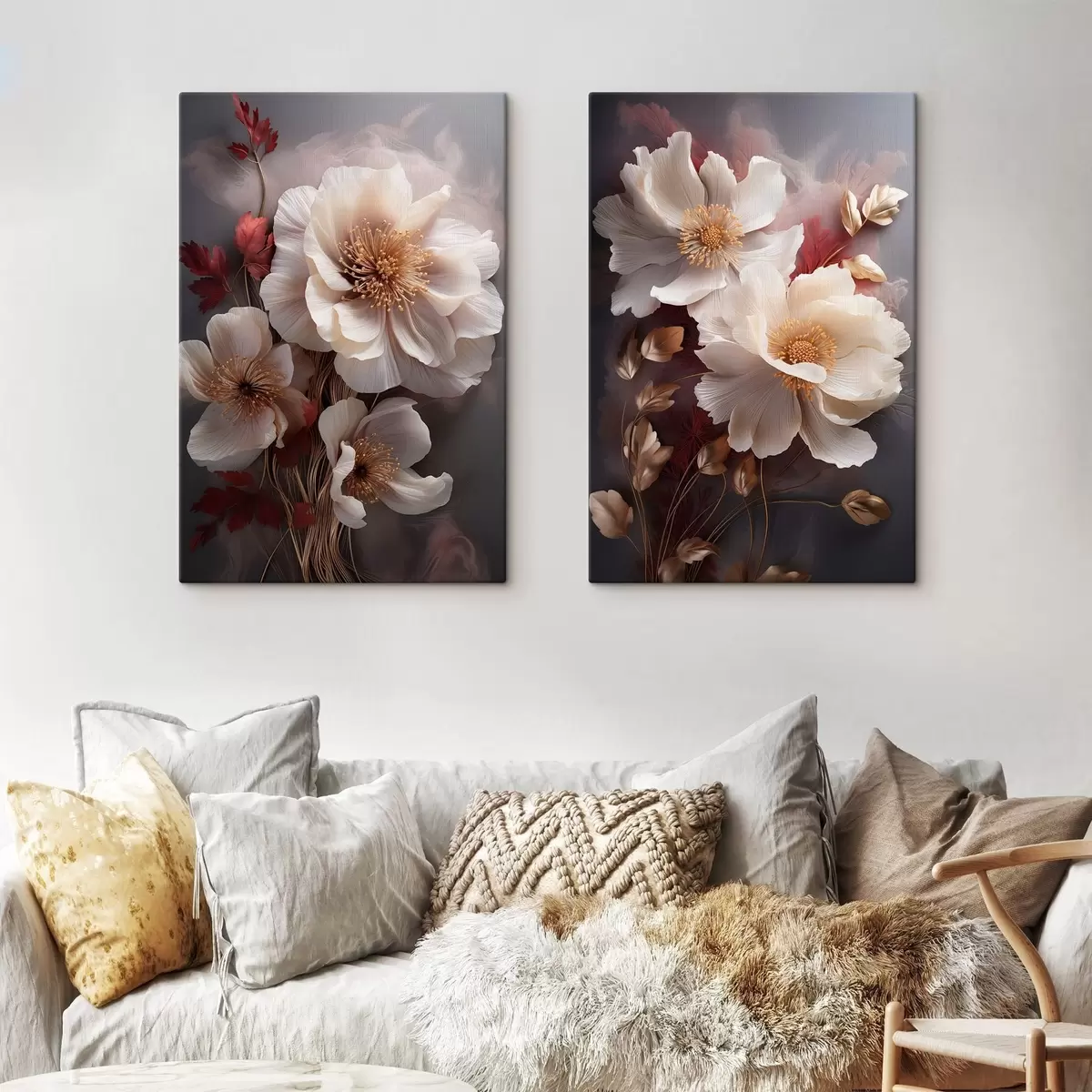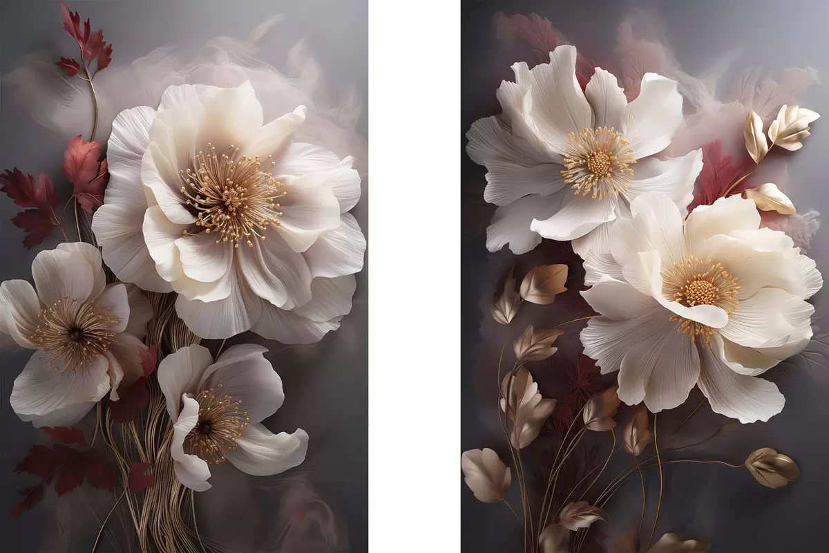 Картина Ніжні півонії з тонкими, легкими пелюстками, оточені темно-червоним і жовтим листям на абстрактному тлі Арт. m01243