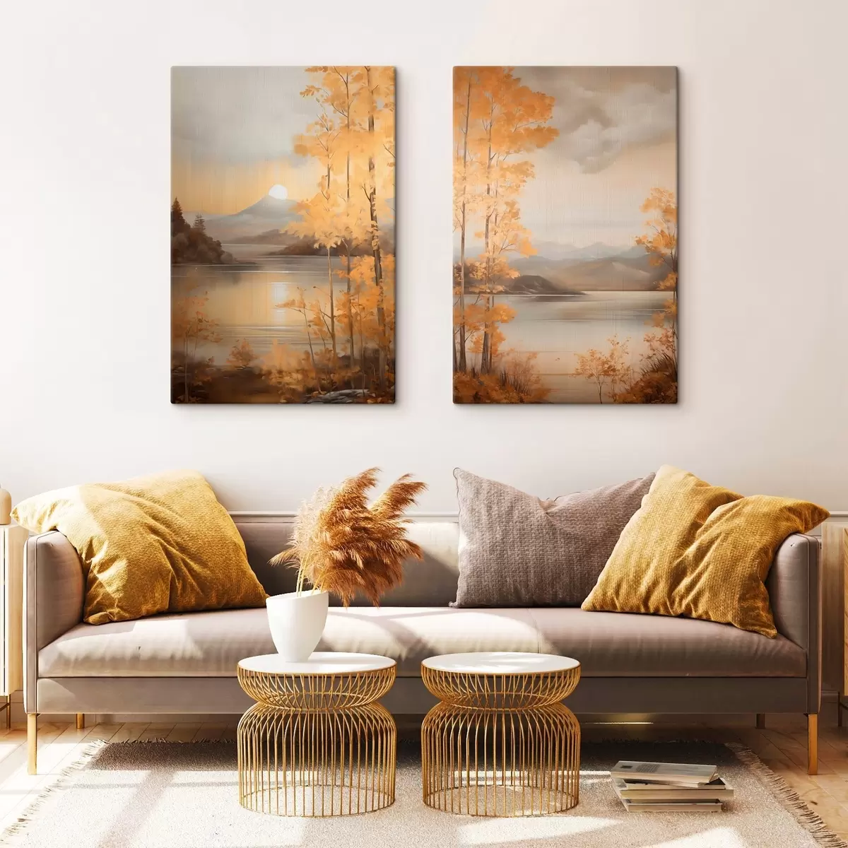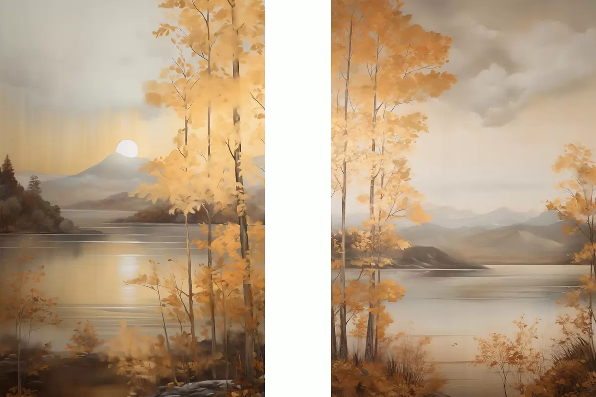 Картина Осінні дерева з помаранчевим листям обрамляють спокійне озеро з далекими горами під хмарним небом. m01246