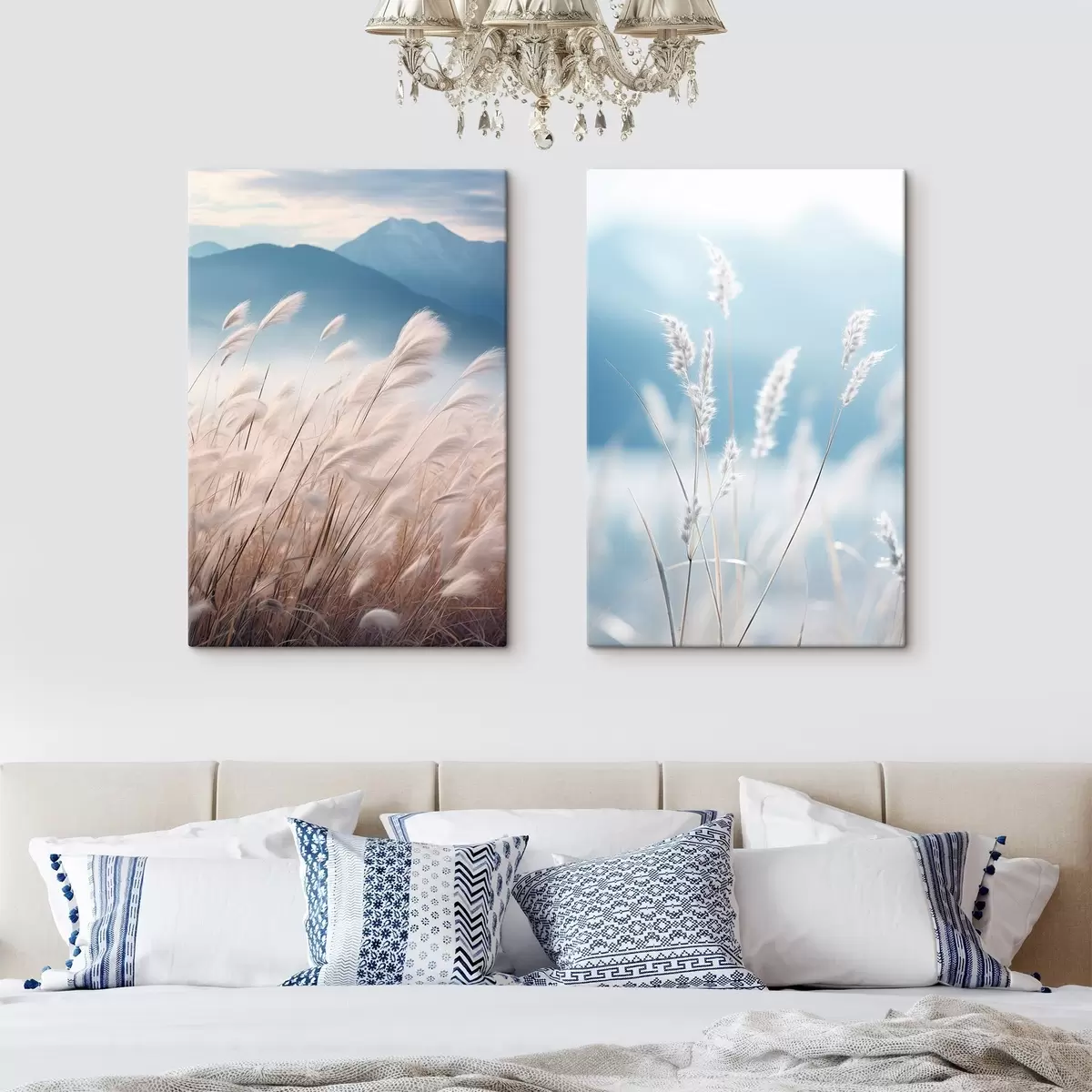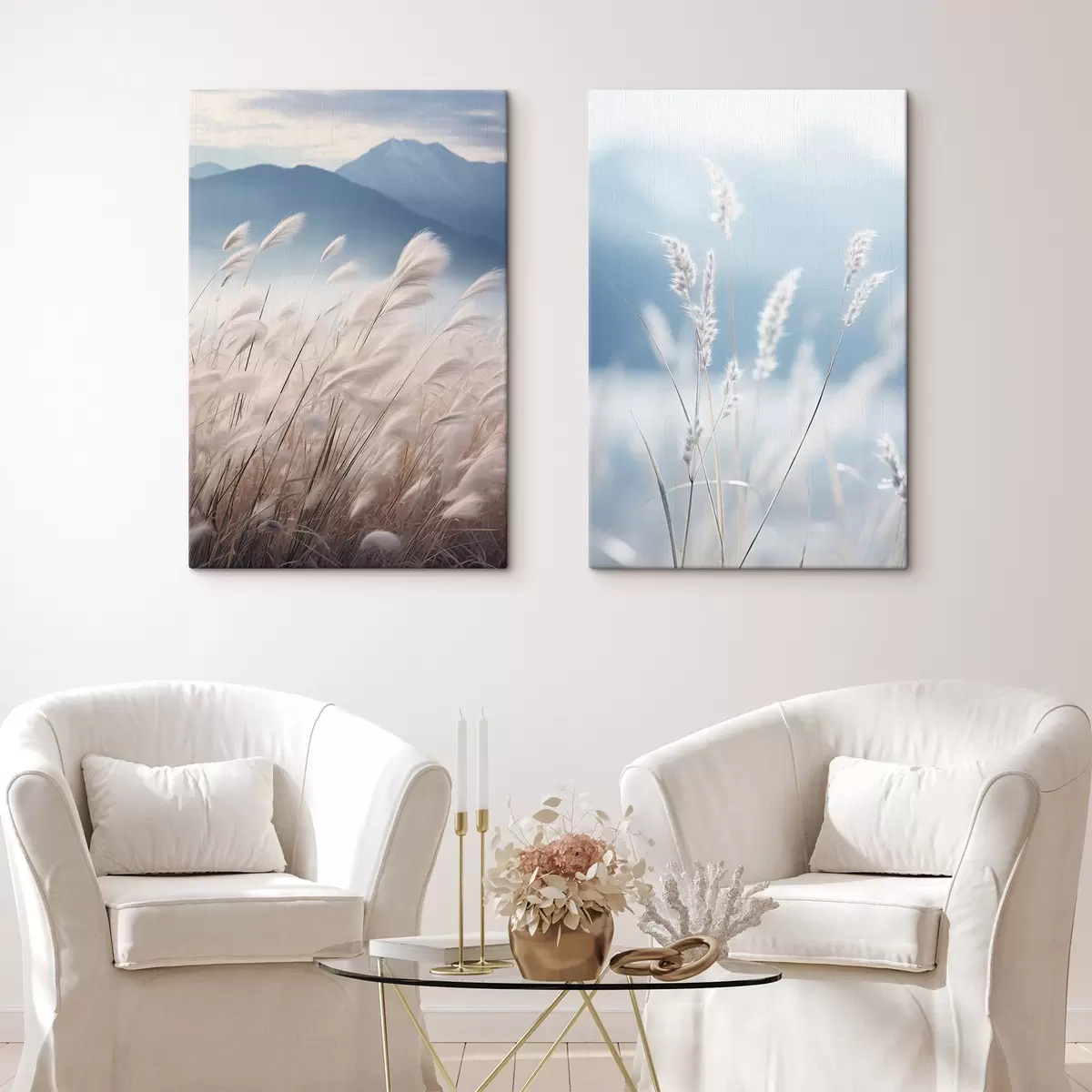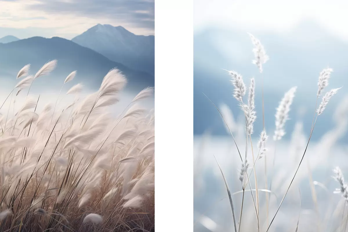 Картина Висока біла трава пампасу, що колишеться на вітрі, на тлі м'яких блакитних гір Арт. m30060