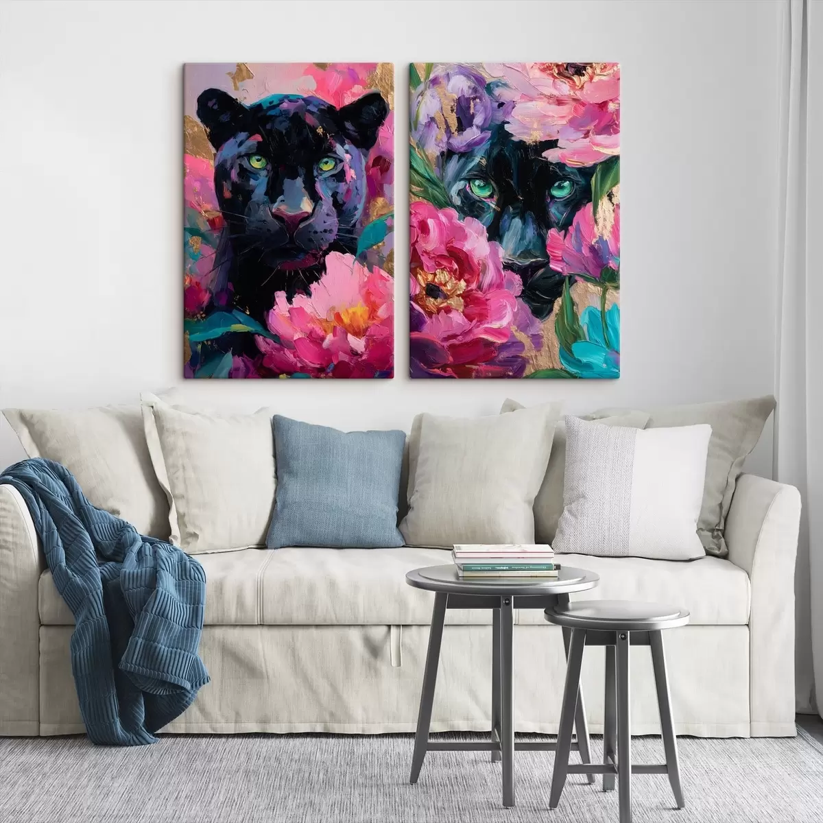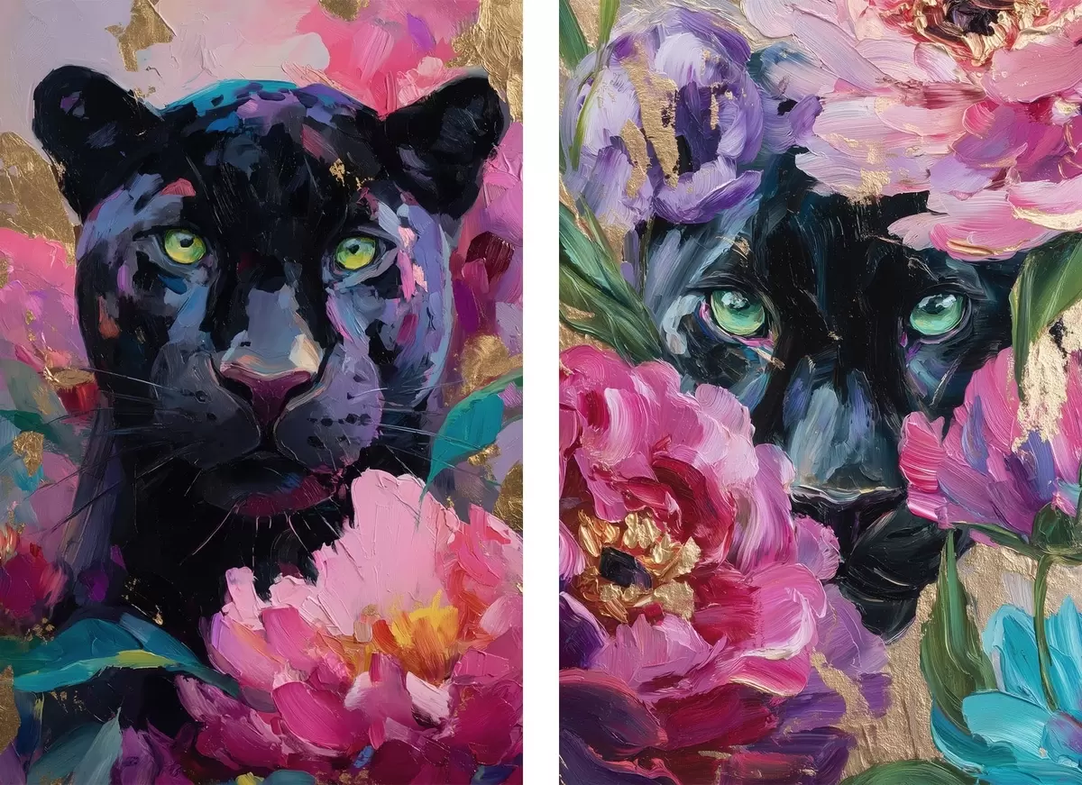 Картина чорна пантера серед півоній m30090