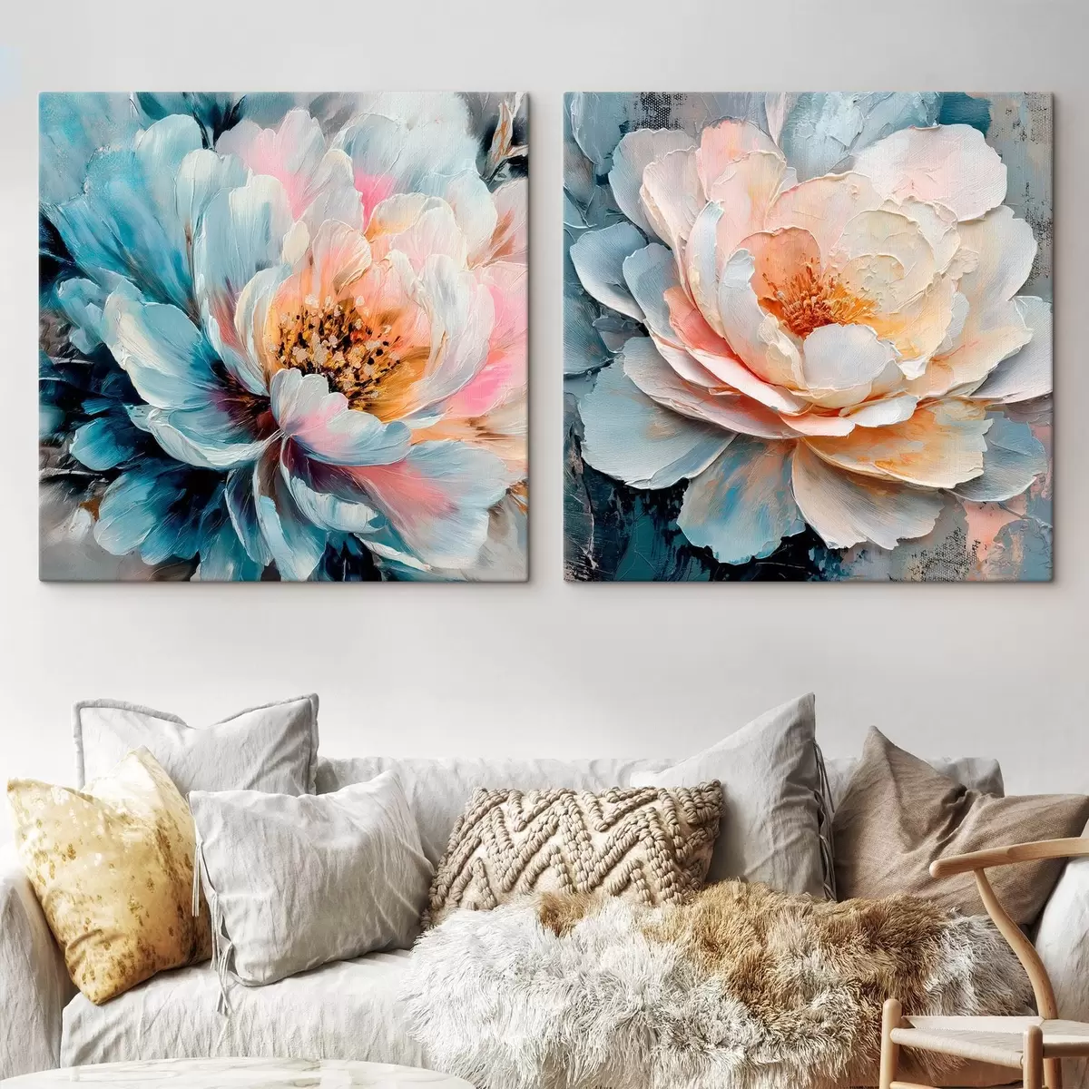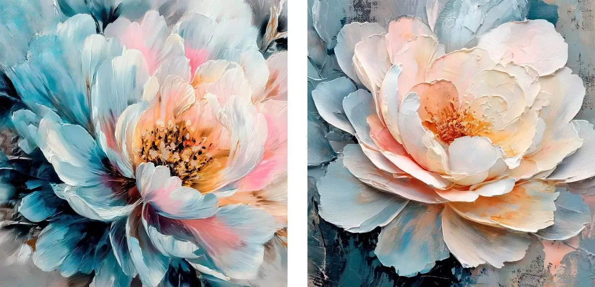 Картина Абстрактна квіткова композиція у рожево-блакитній гамі з фактурними пелюстками Арт. m30148