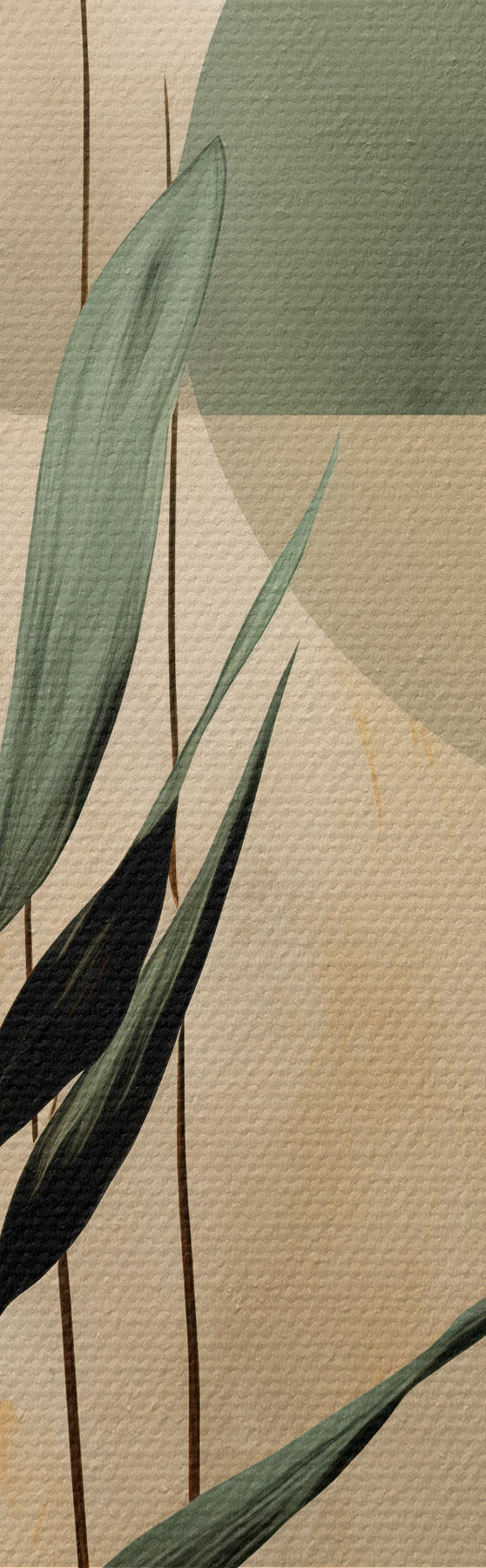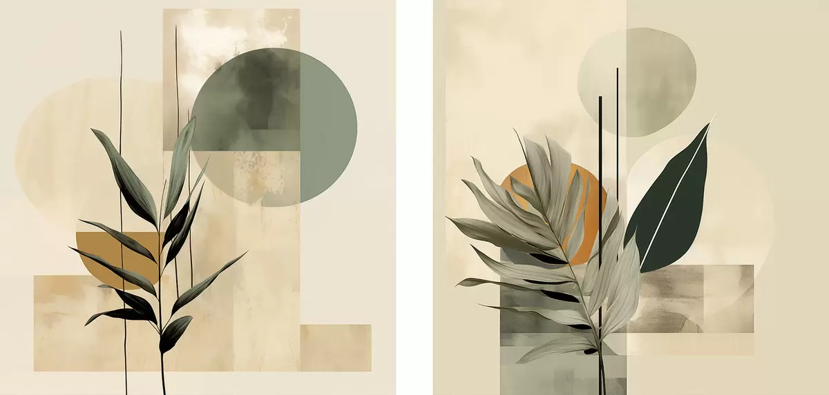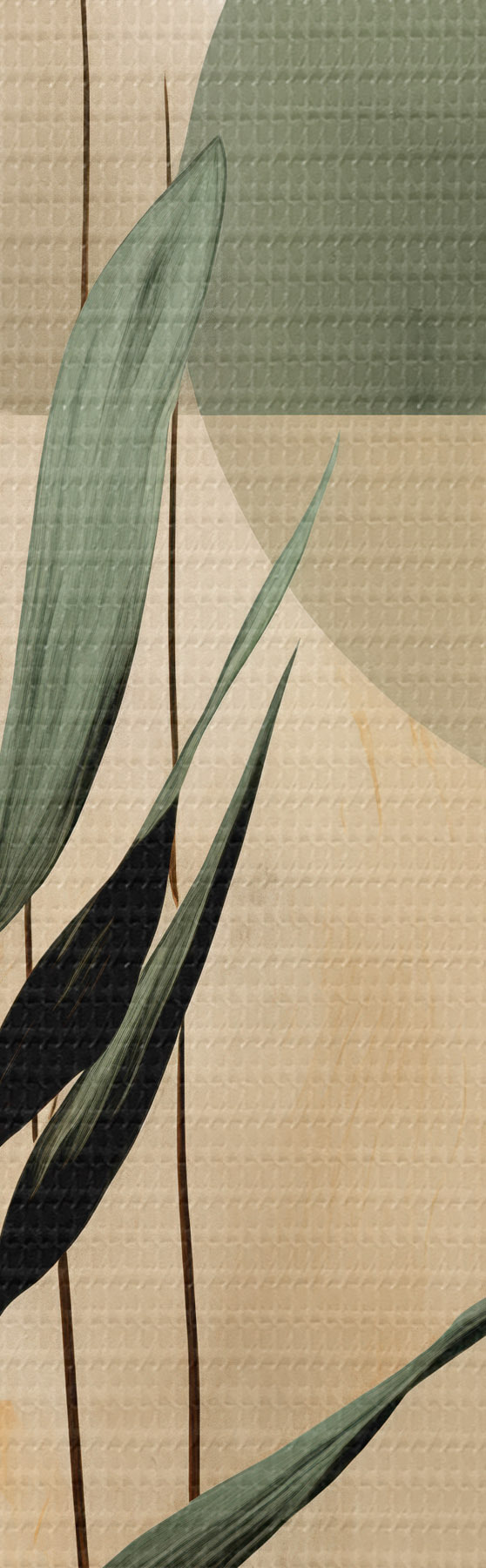 Картина Темно-зелена рослина з абстрактними геометричними фігурами та акварельними текстурами бежевого та зеленого кольорів Арт. m30209