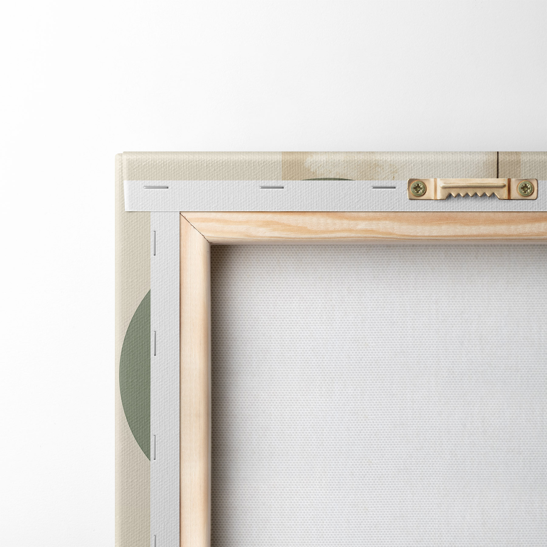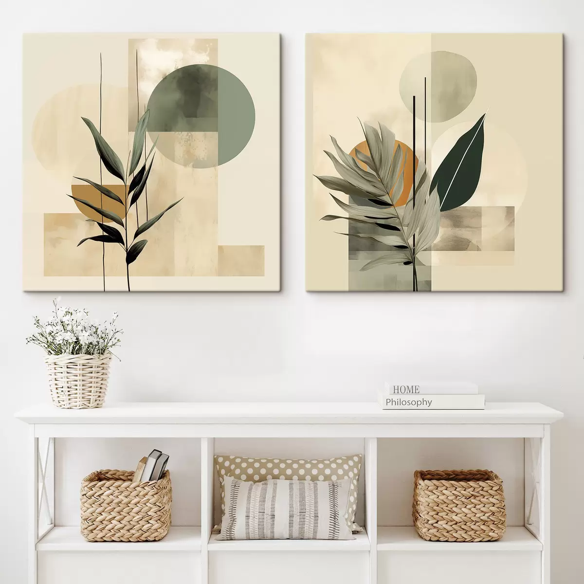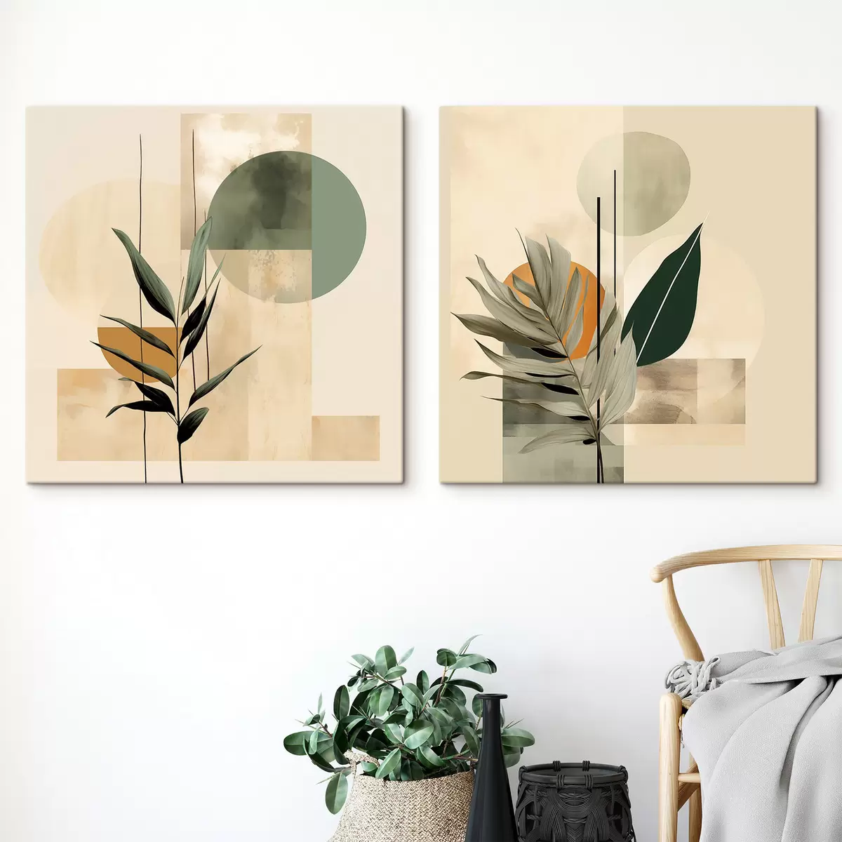 Картина Темно-зелена рослина з абстрактними геометричними фігурами та акварельними текстурами бежевого та зеленого кольорів Арт. m30209