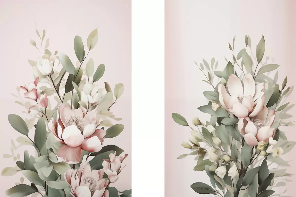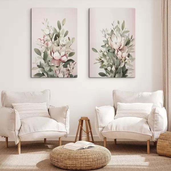 Картина Букет пастельних квітів з листям евкаліпта на блідо-рожевому тлі Арт. m30314
