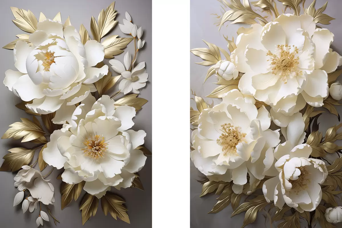 Картина Великі білі півонії з жовтим листям на сірому тлі m30327