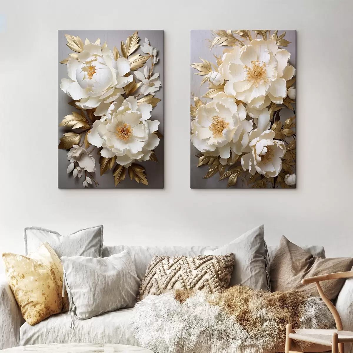 Картина Великі білі півонії з жовтим листям на сірому тлі Арт. m30327