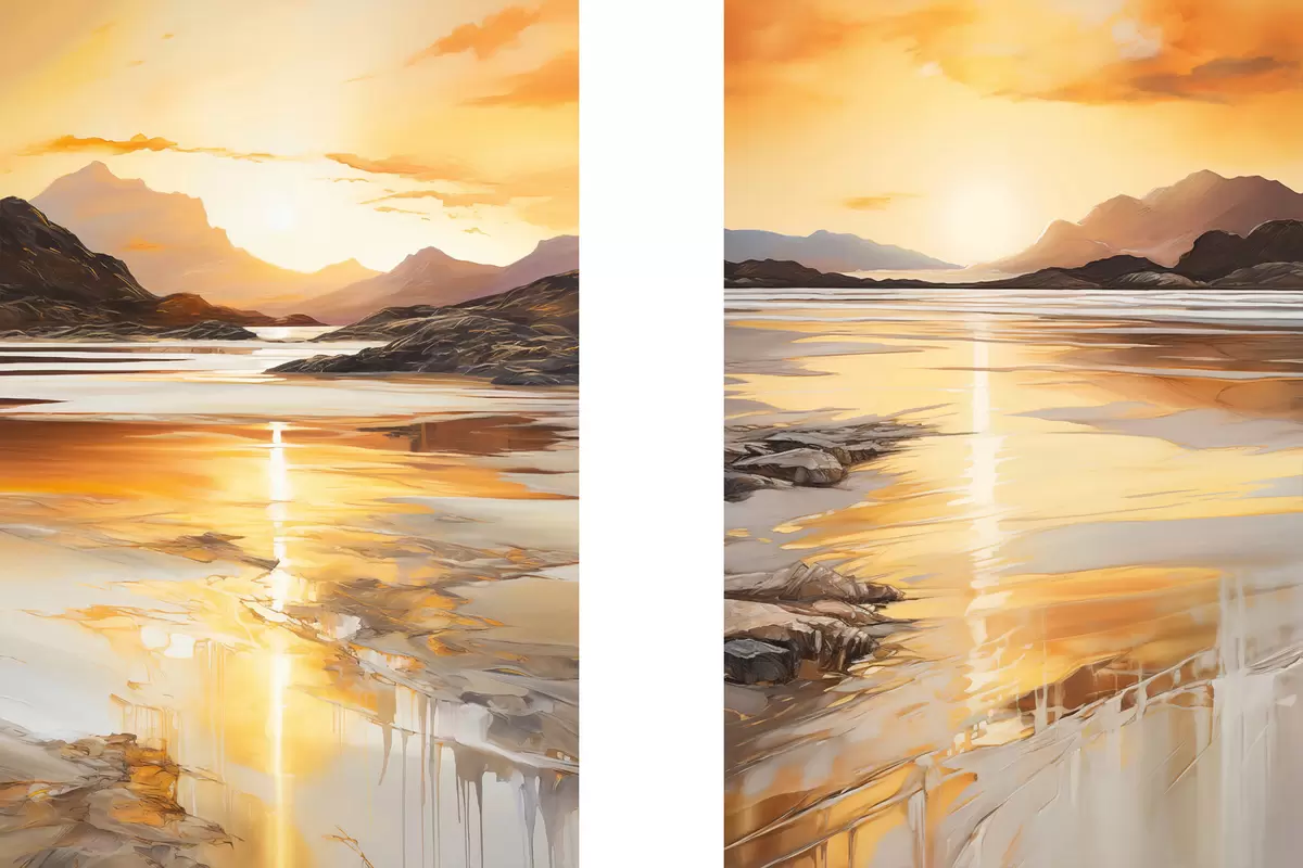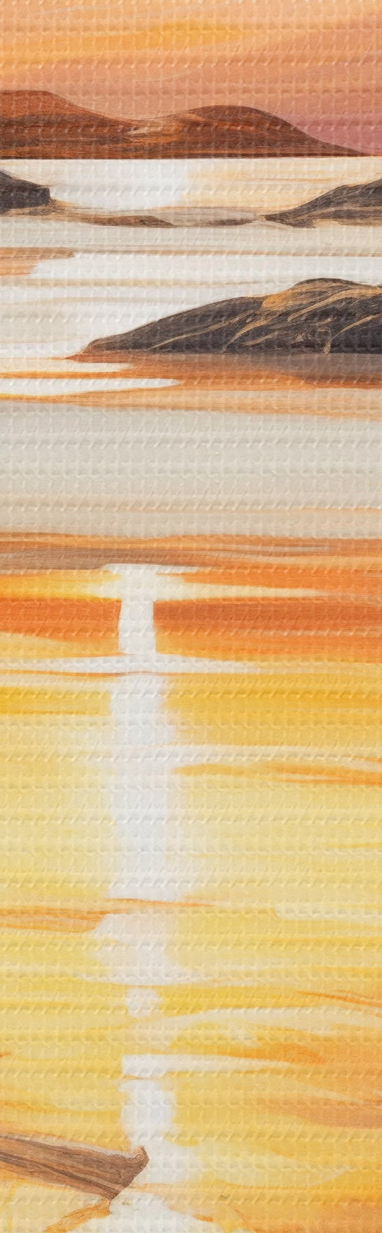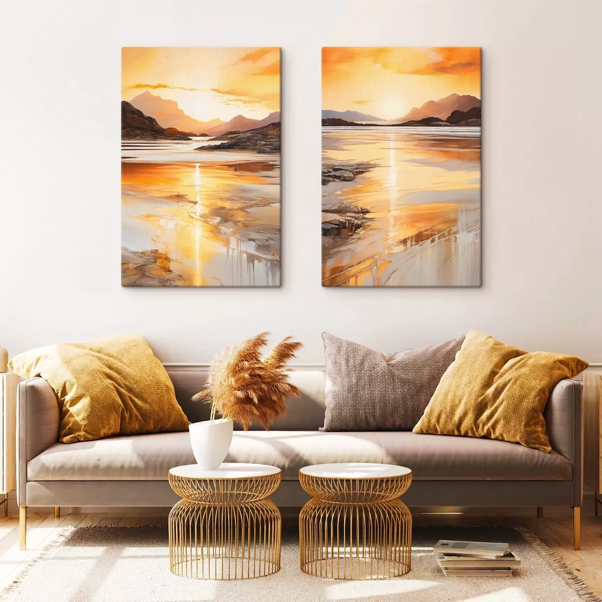 Картина Пейзаж із річкою та горами під теплим помаранчевим небом, захід сонця Арт. m30328