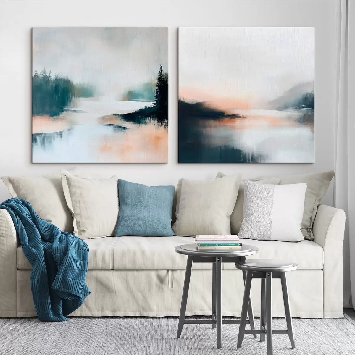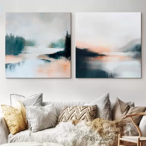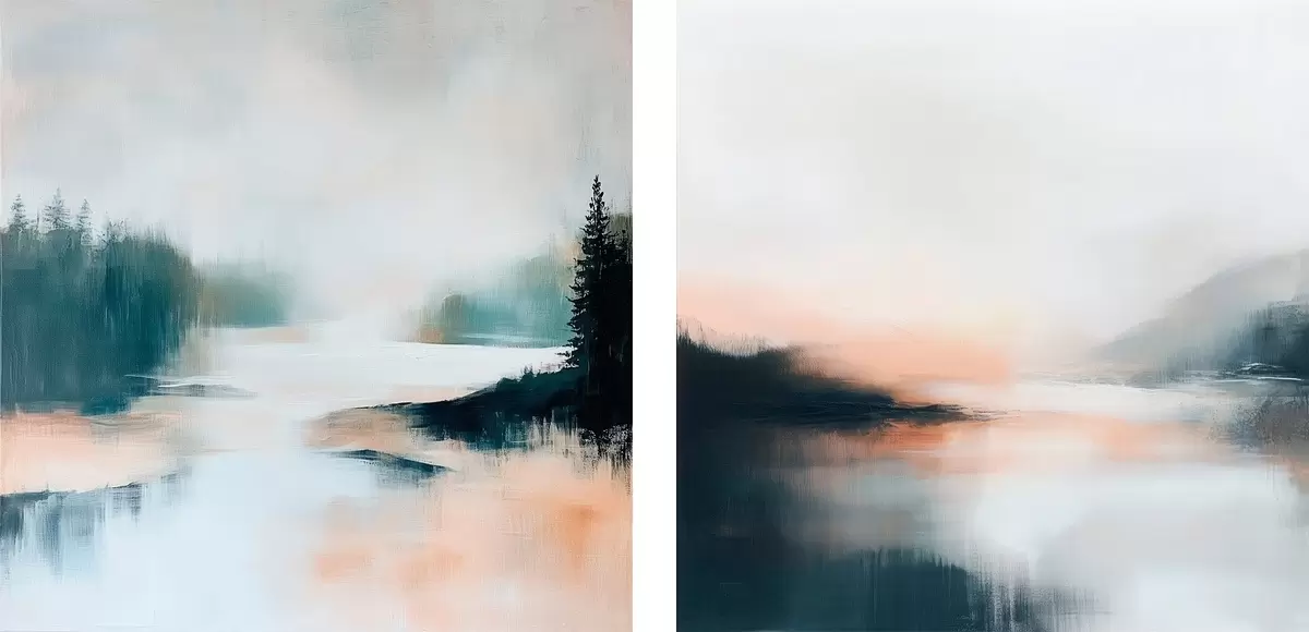Картина Туманний пейзаж із хвойними деревами та озером, виконаний у сучасному художньому стилі m30357