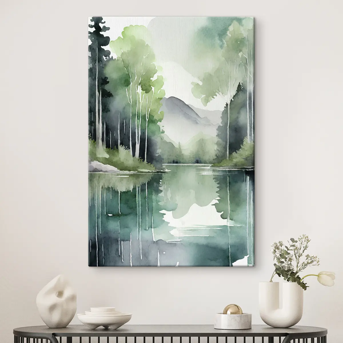 Картина Акварель Озерний та лісовий пейзаж, весна, м'які природні зелені кольори Арт. s36503