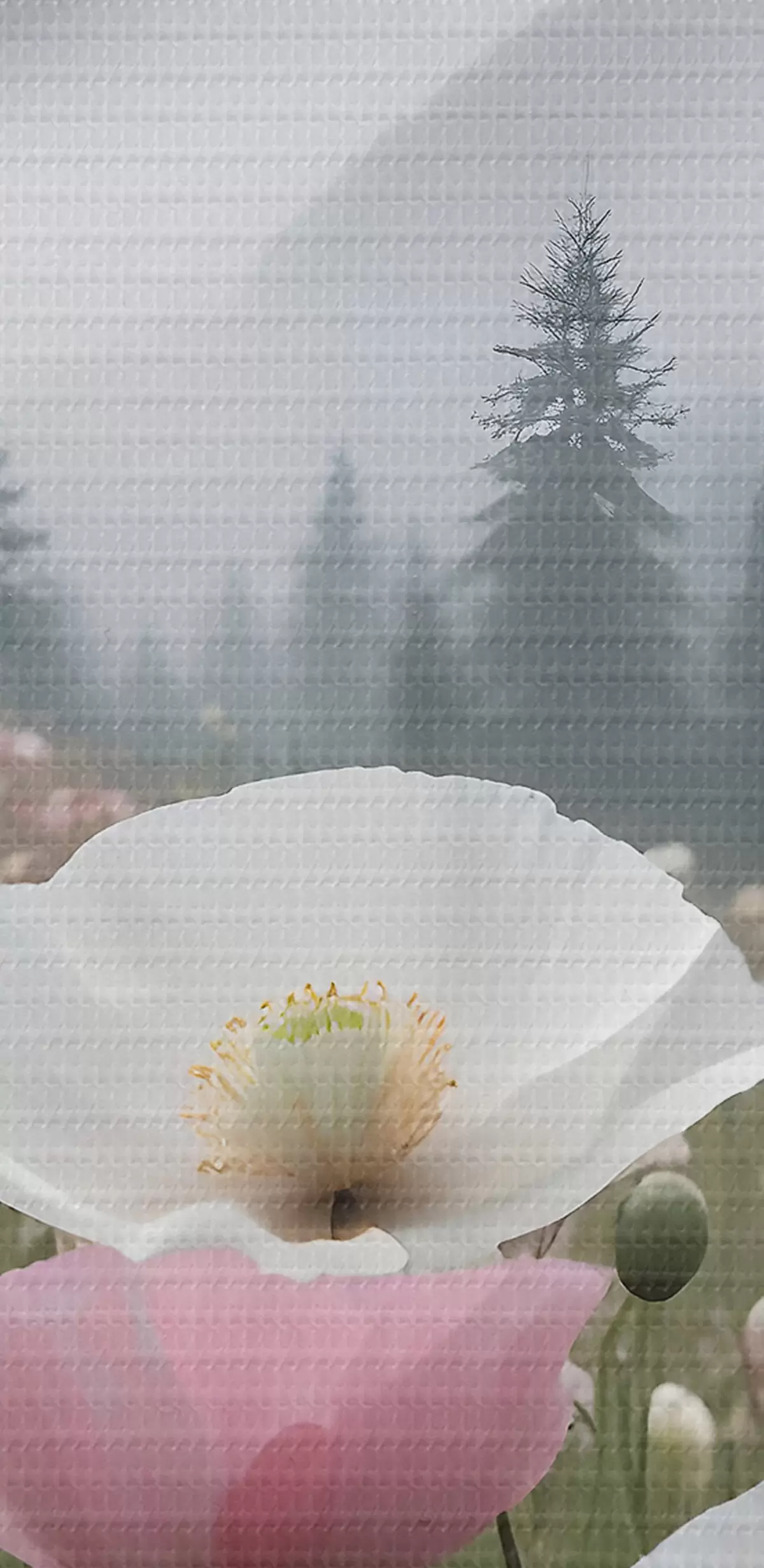 Картина Поле рожевих і білих маків у гірському ландшафті на задньому плані s38369