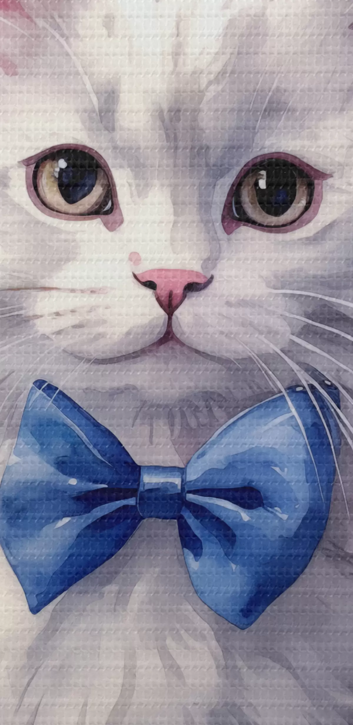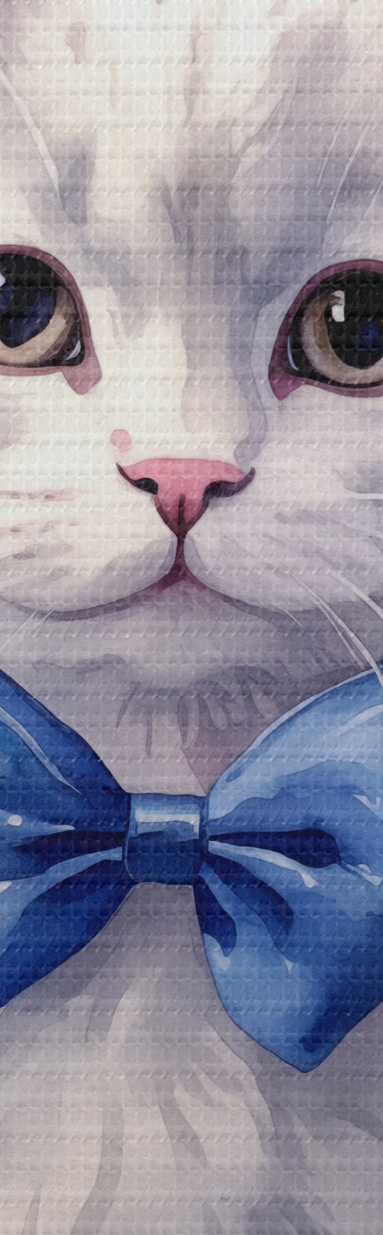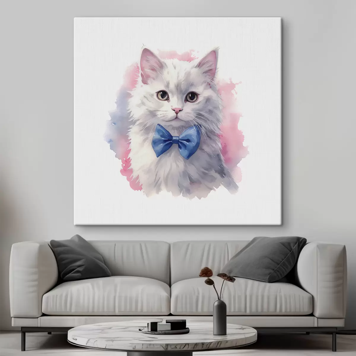 Картина Білий пухнастий кіт з синім бантом на шиї, акварель, тварина, сірий, білий, рожевий, блакитний колір Арт. s38479