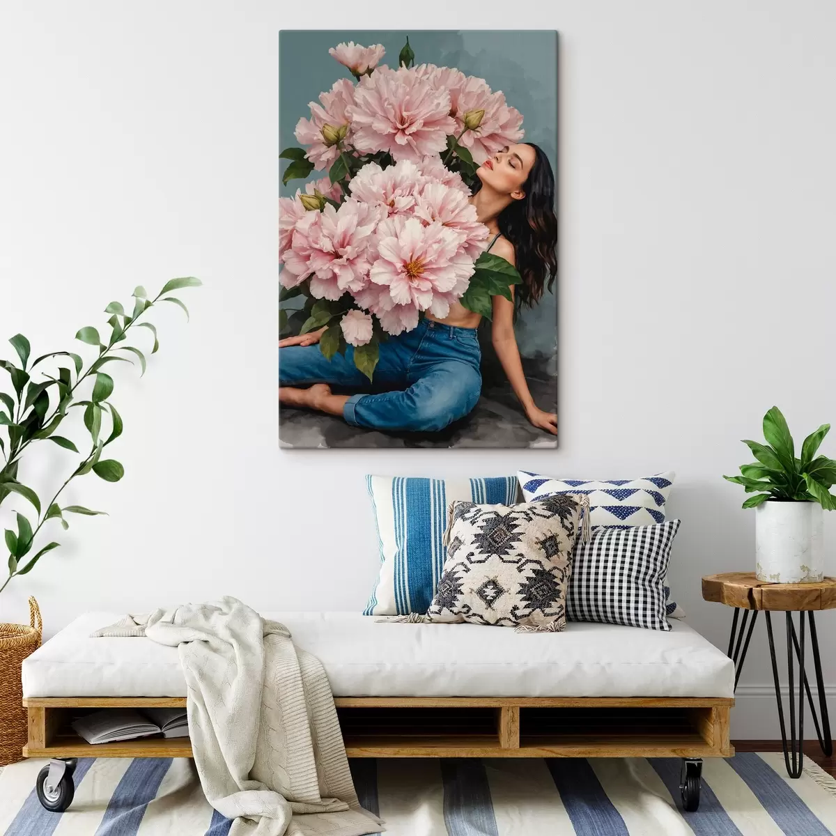 Картина Жінка сидить на підлозі з великим букетом квітів Арт. s38595