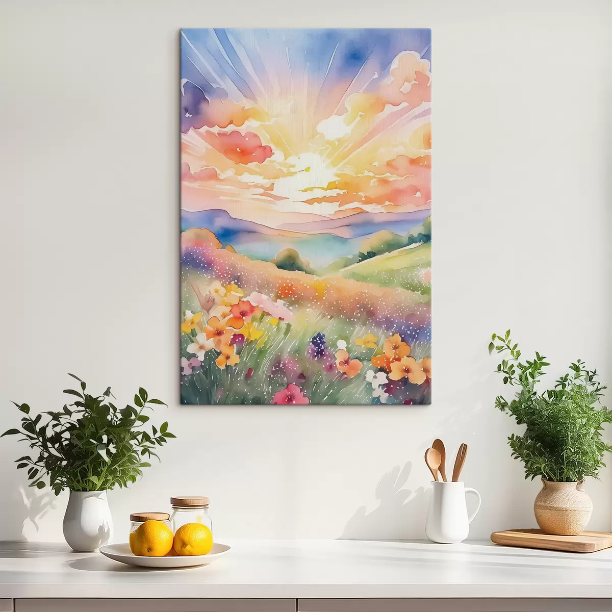 Картина Захід сонця в літньому полі, квіти, сонце, барвисте небо, хмари, природа Арт. s38842