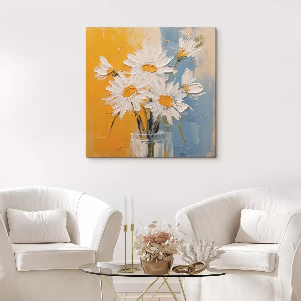 Картина Білі ромашки у скляній вазі на синьо-жовтому тлі, імітація олійного живопису, великі мазки Арт. s38907