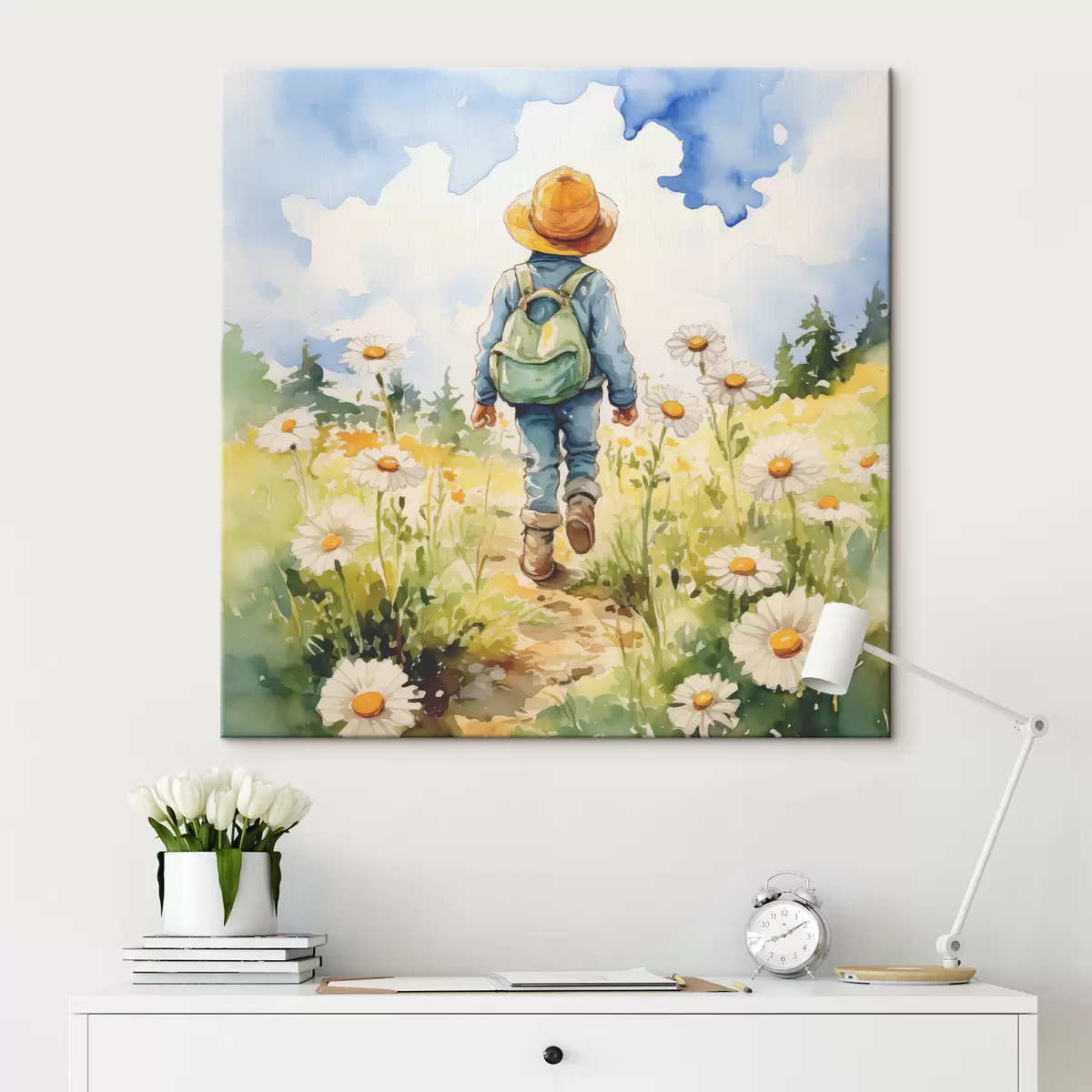 Картина Хлопчик у ковбойському капелюсі з зеленим рюкзаком за спиною та синім костюмі йде стежкою в ромашковому полі, акварель Арт. s38946