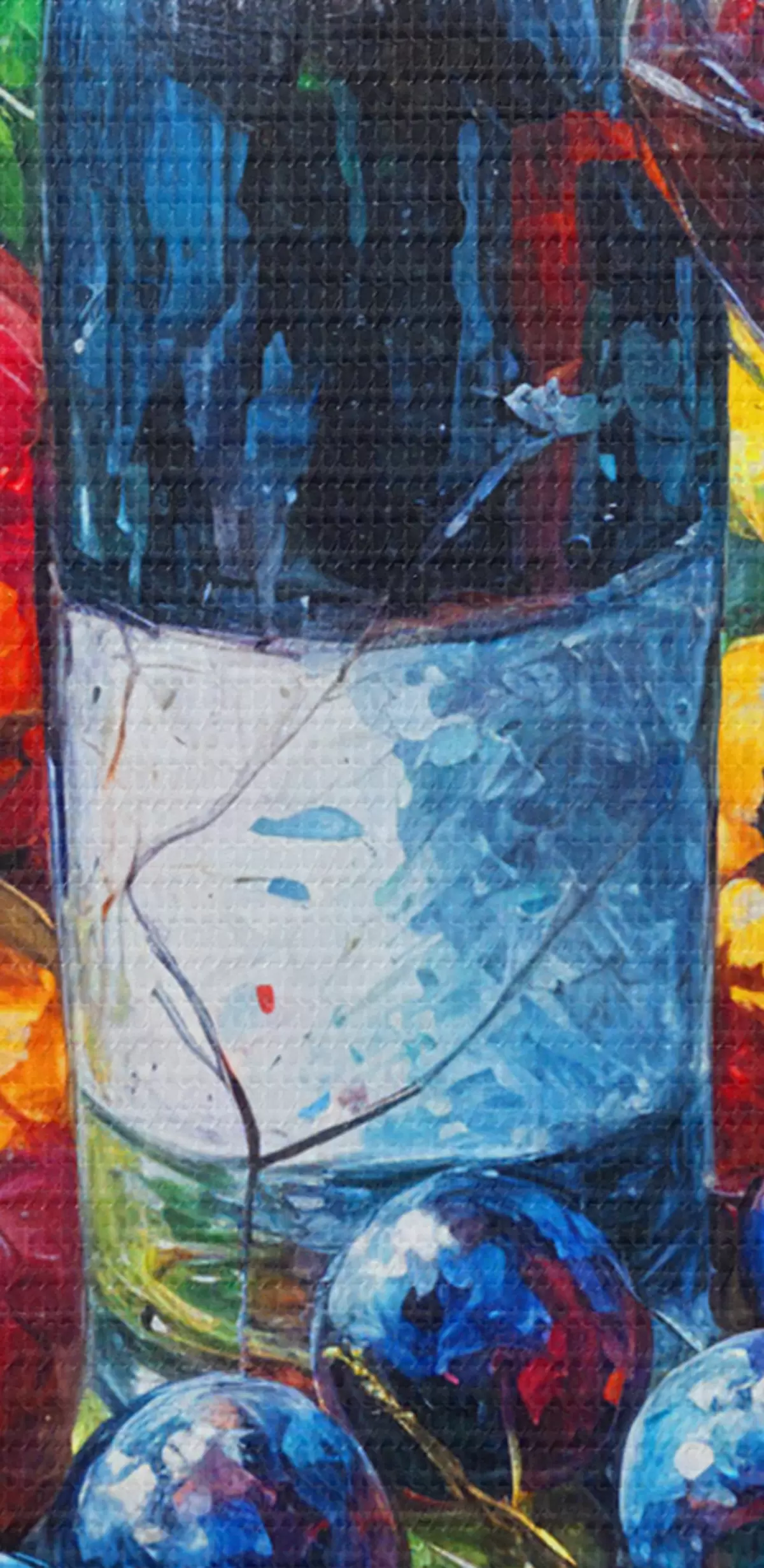 Картина Абстрактний натюрморт із зображенням пляшки вина, келиха вина та різнокольорових фруктів із вкрапленнями різних кольорів s38958