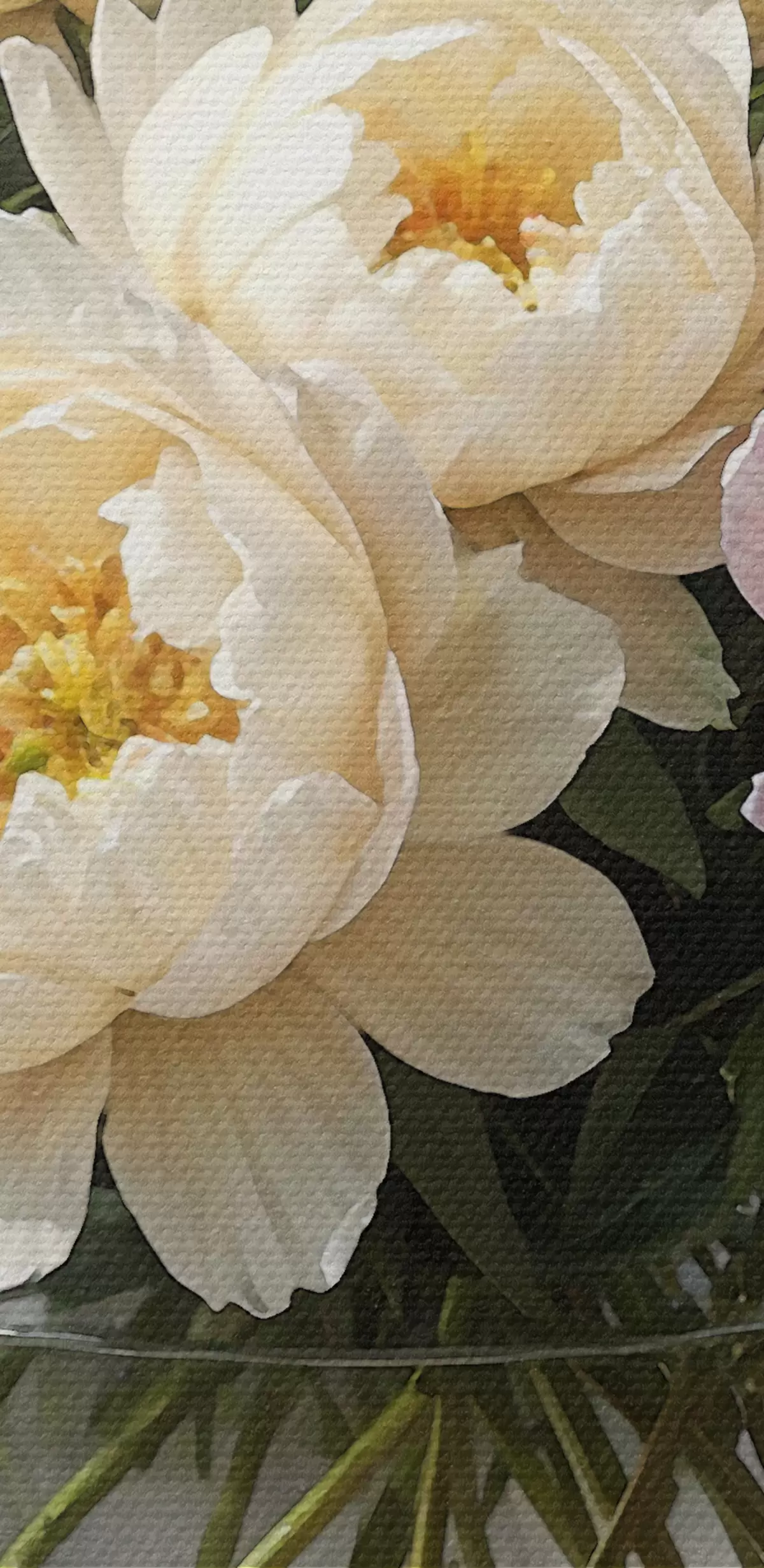 Картина Розпис букета красивих білих і рожевих півоній у скляній вазі на дерев'яному столі Арт. s38967
